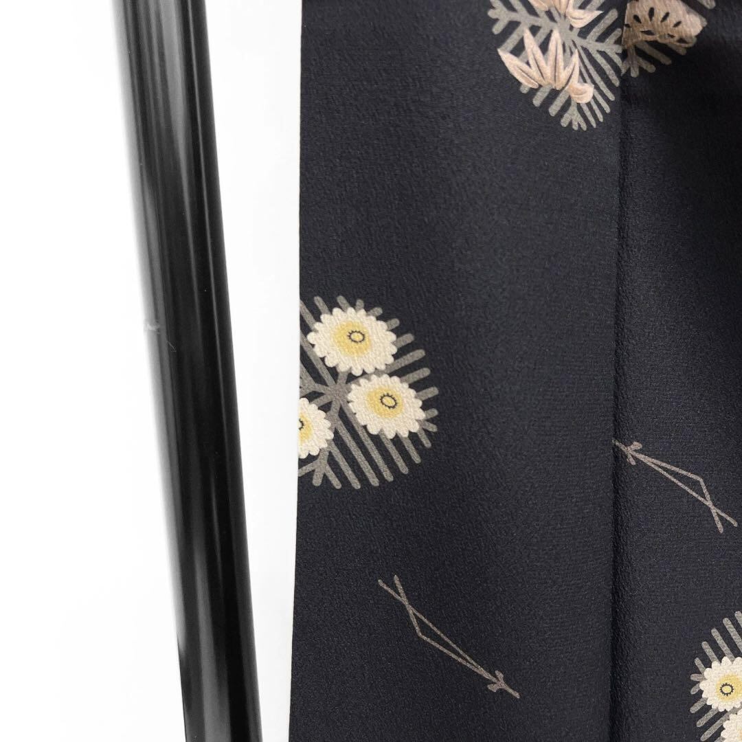 黒地にくすみカラーの松葉や松紋に菊、楓、松が描かれたお洒落なデザインの一着です。