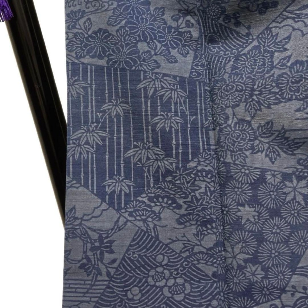 グレーとくすみネイビーの裂取り地に松竹梅やヱ霞、菊と流水や牡丹が描かれたお洒落なデザインの一着です。