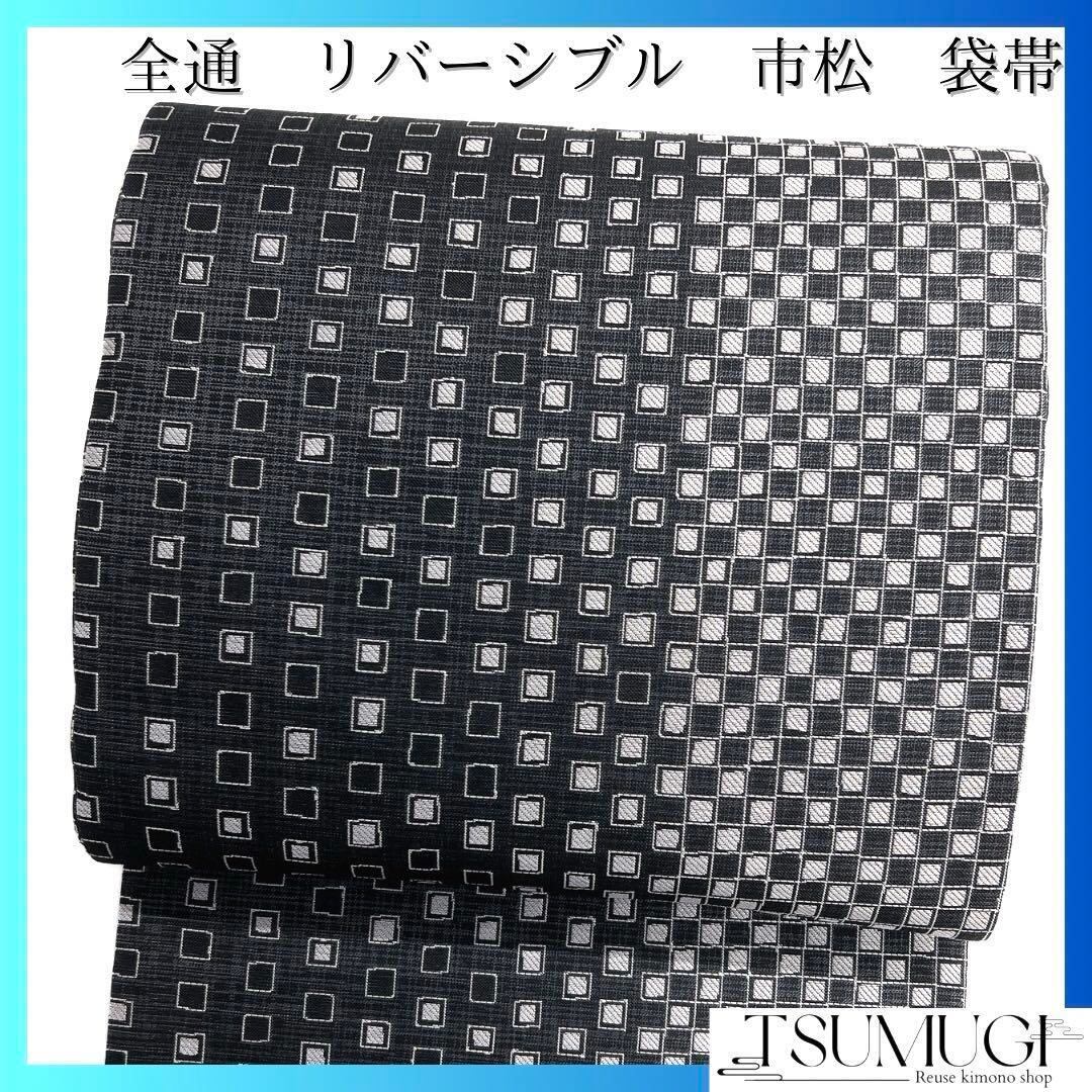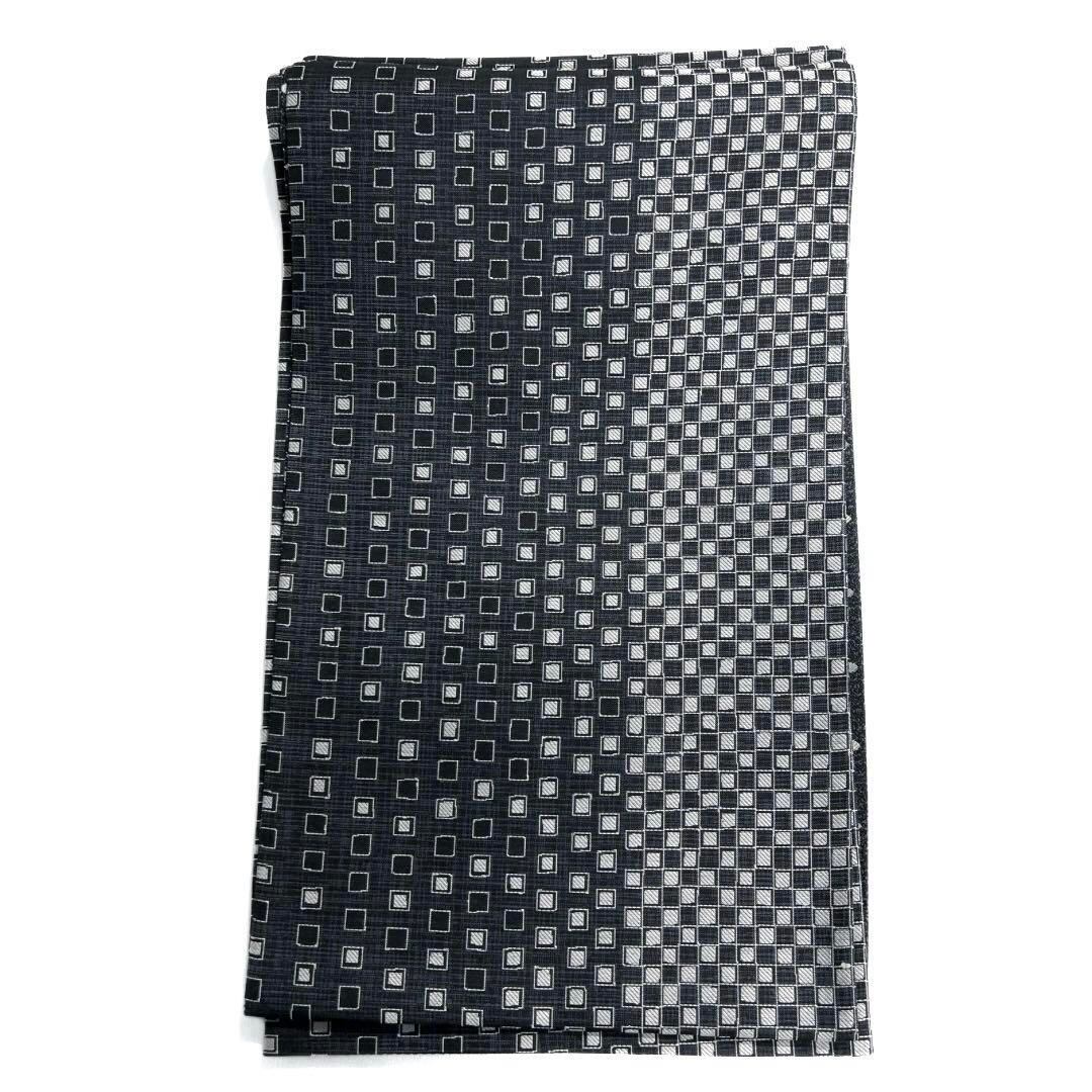 黒とグレーの変わり格子地に縦に市松文様と四角の文様が織られたお洒落なデザインです。