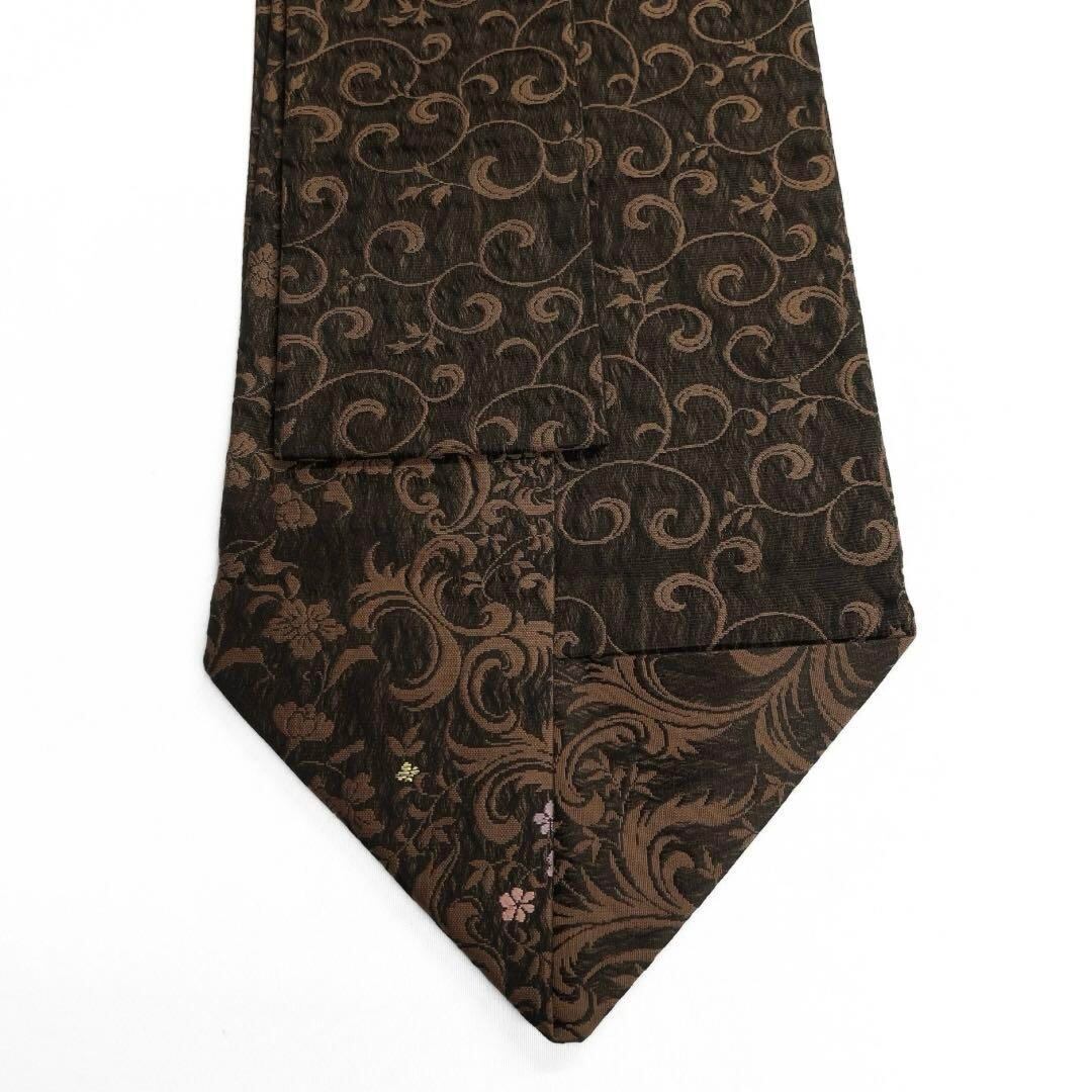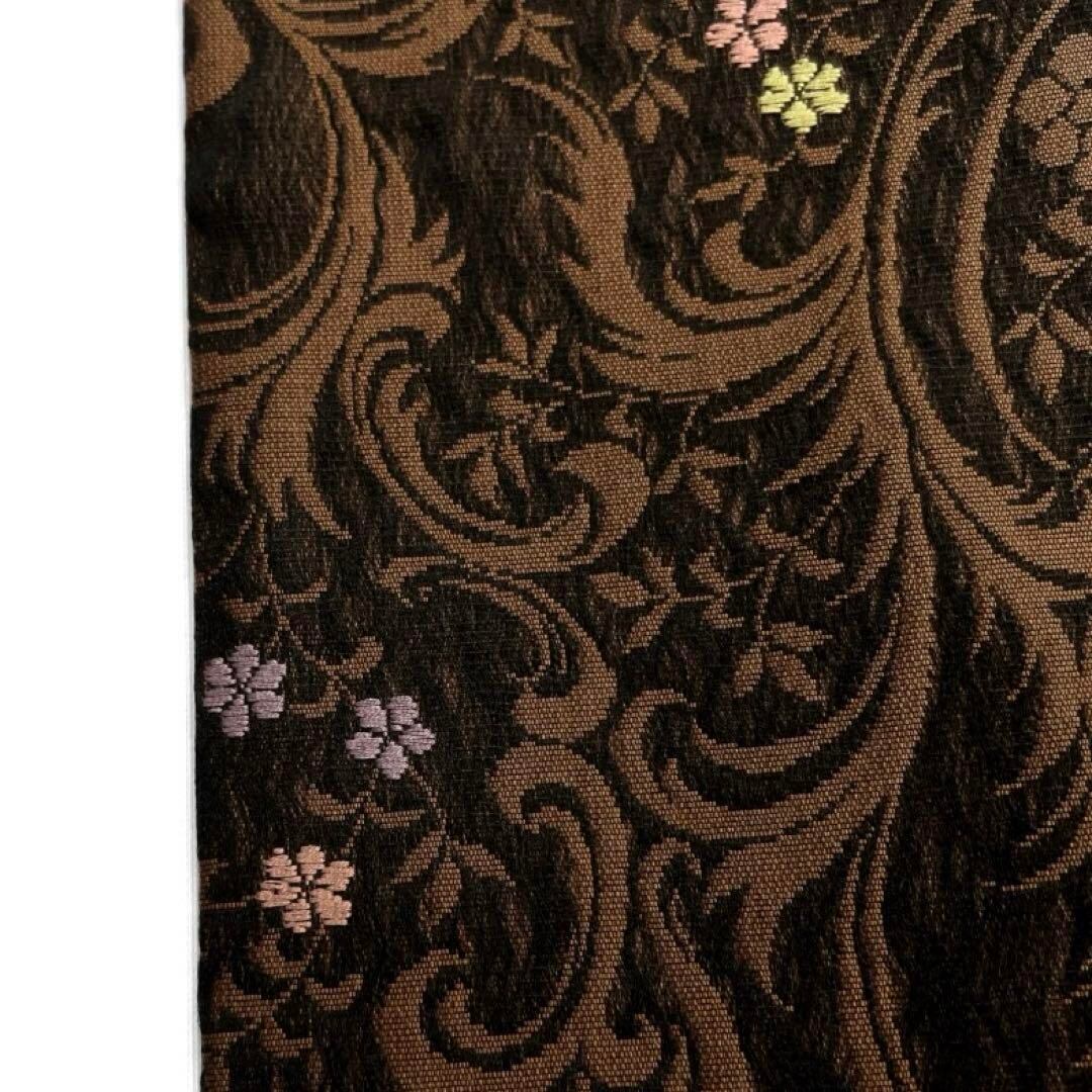 ブラウン地に黒の掬いにブラウンで織られた唐草花模様にパステルカラーの小花が映えるお洒落なデザインの一着です。