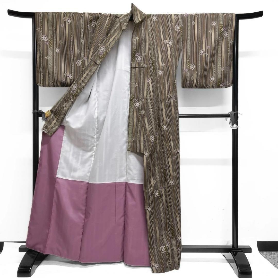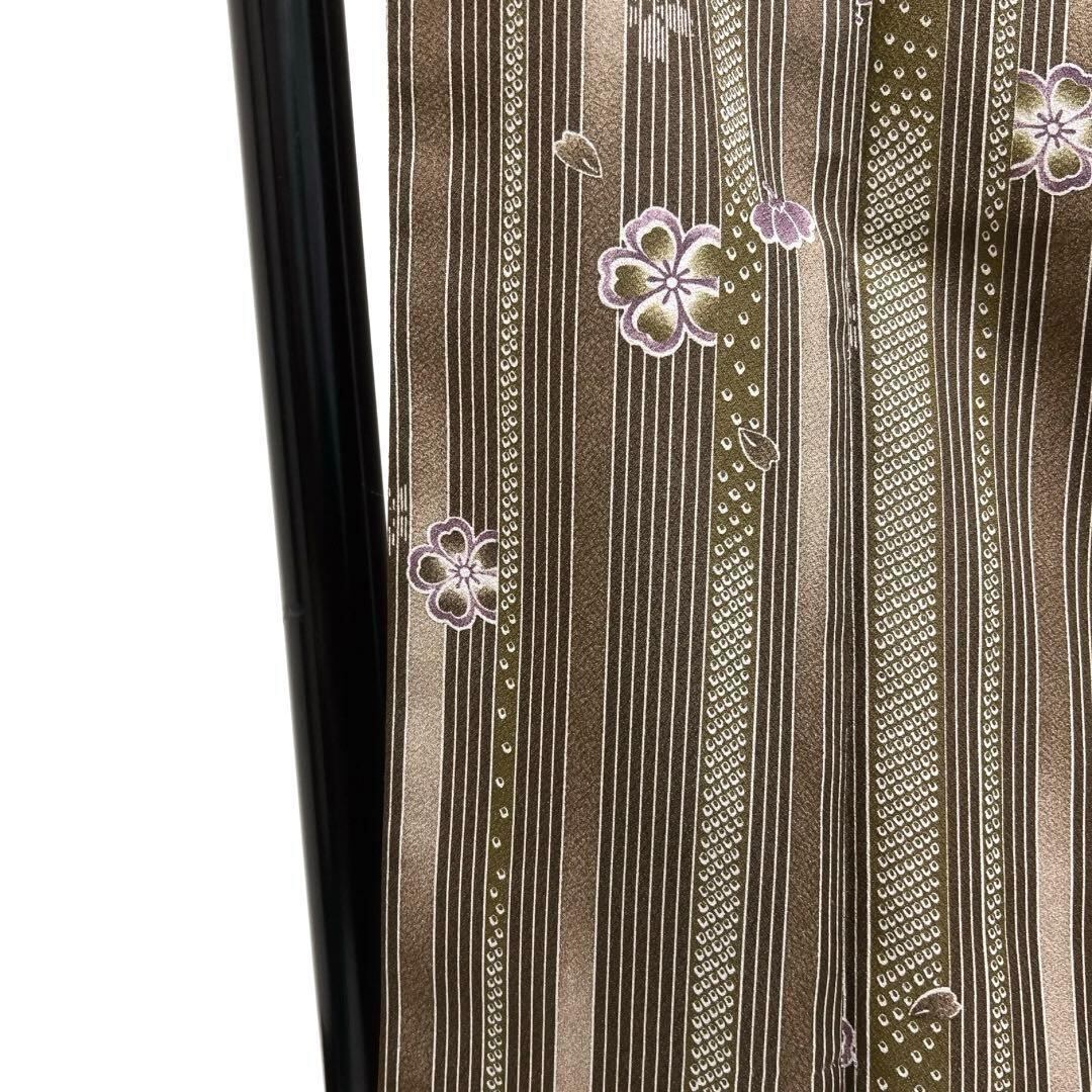 ブラウンの縦縞に花びらや桜の文様が描かれたお洒落なデザインの一着です。