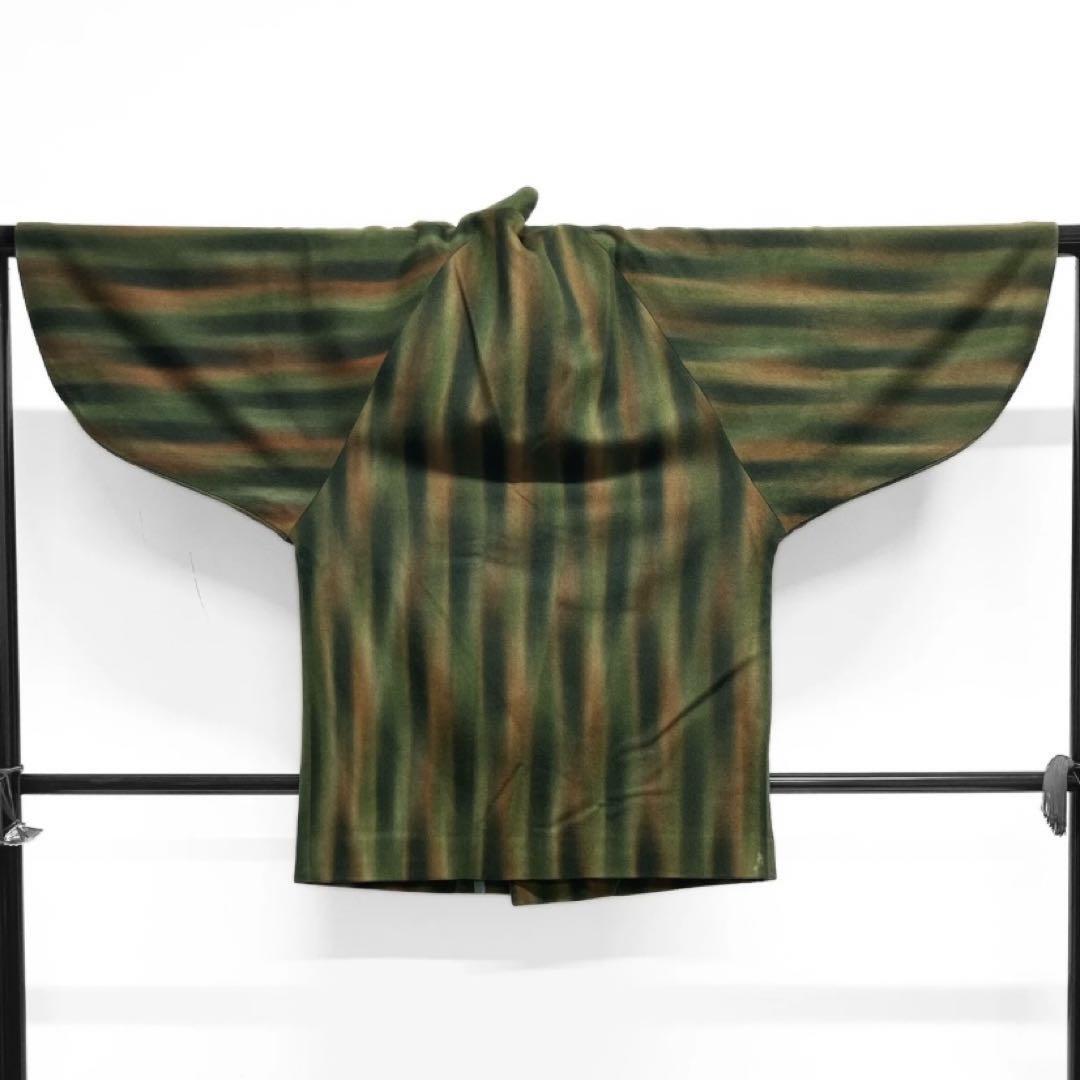 グリーンとブラウンのカラーで描かれた抽象的な縞模様が描かれたお洒落なデザインの一着です。