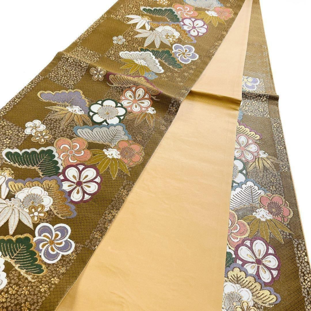松竹梅と鹿の子模様、花模様の袋帯です。