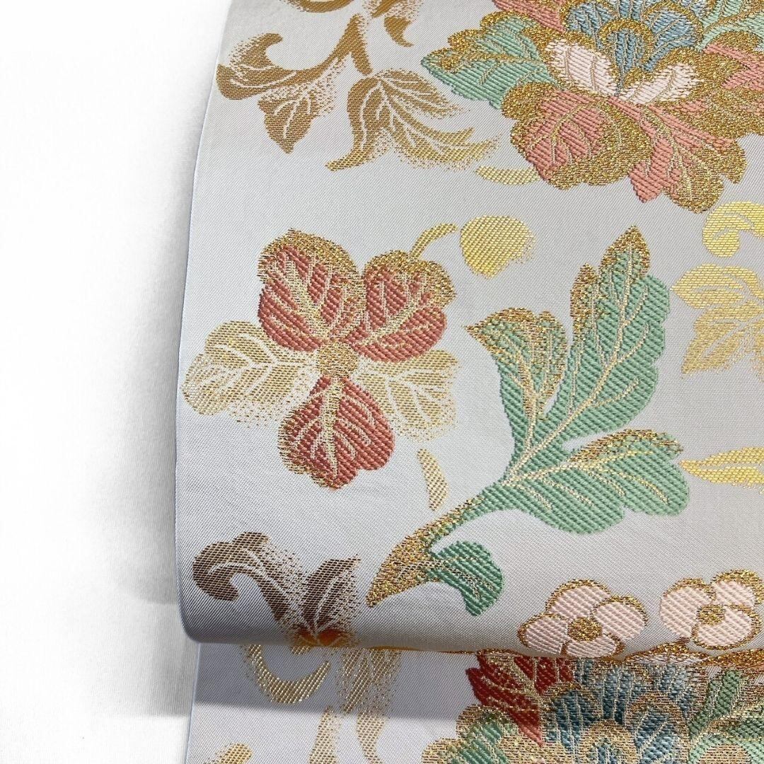 白地に桐の花、唐花模様が織り出された袋帯です。