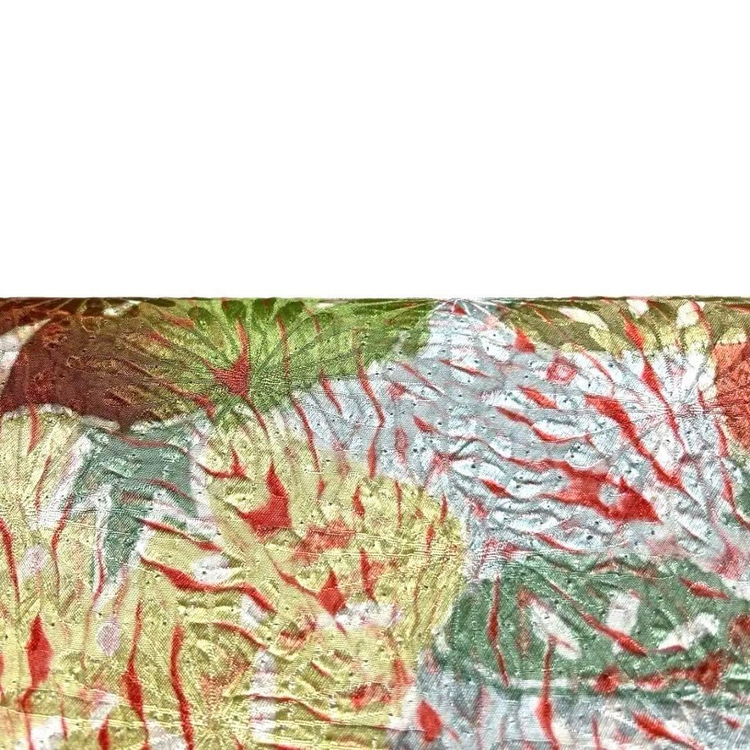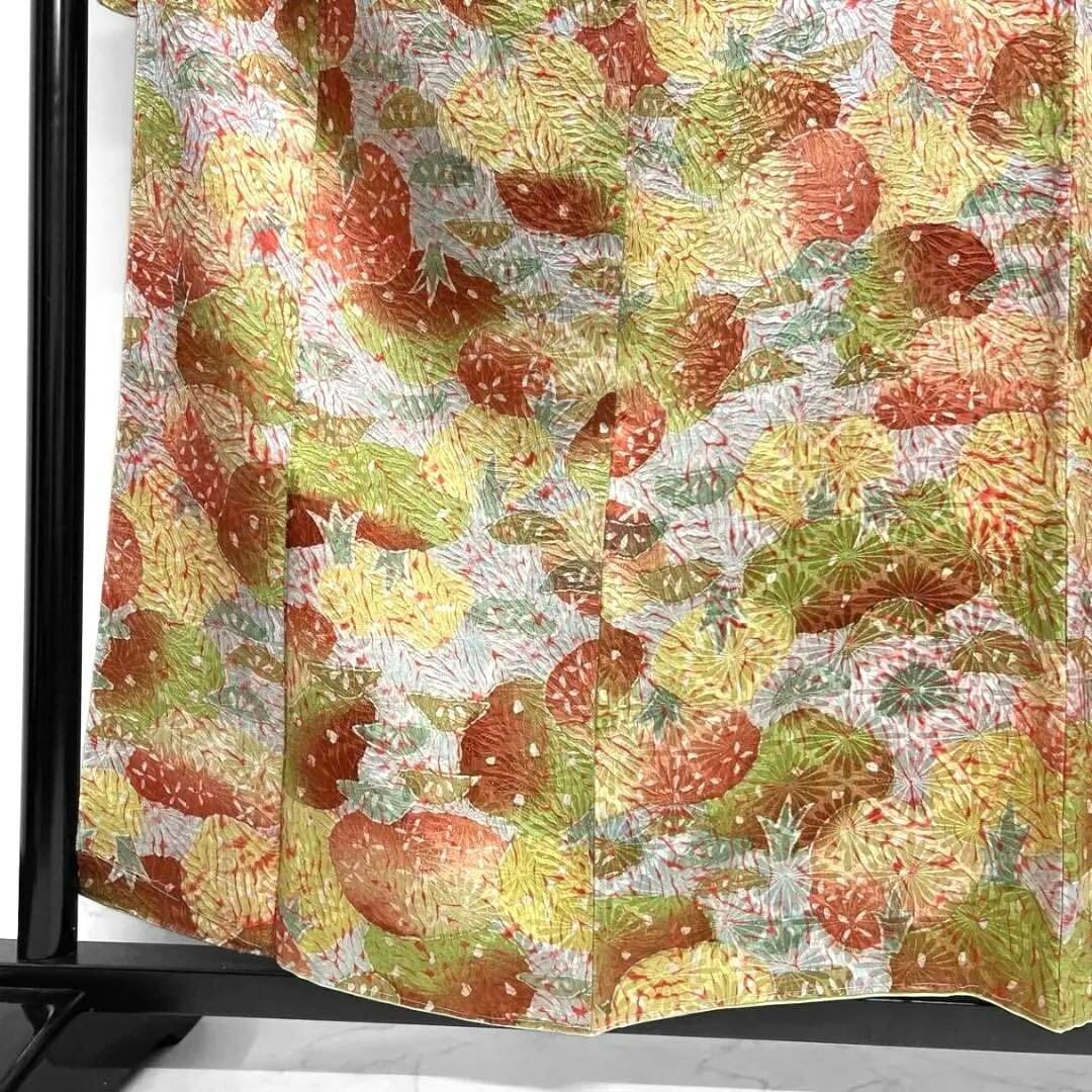 松や花菱、リーフ模様が鮮やかに描かれた珍しいデザインの一着です。