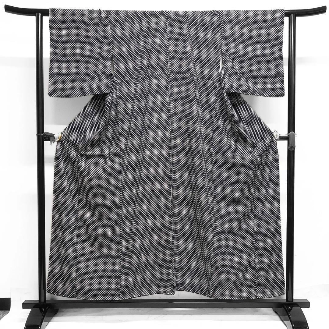 黒地に白のドットの中に縦縞が描かかれ遠目には亀甲のようにも見えるお洒落なデザインの粋な一着です。