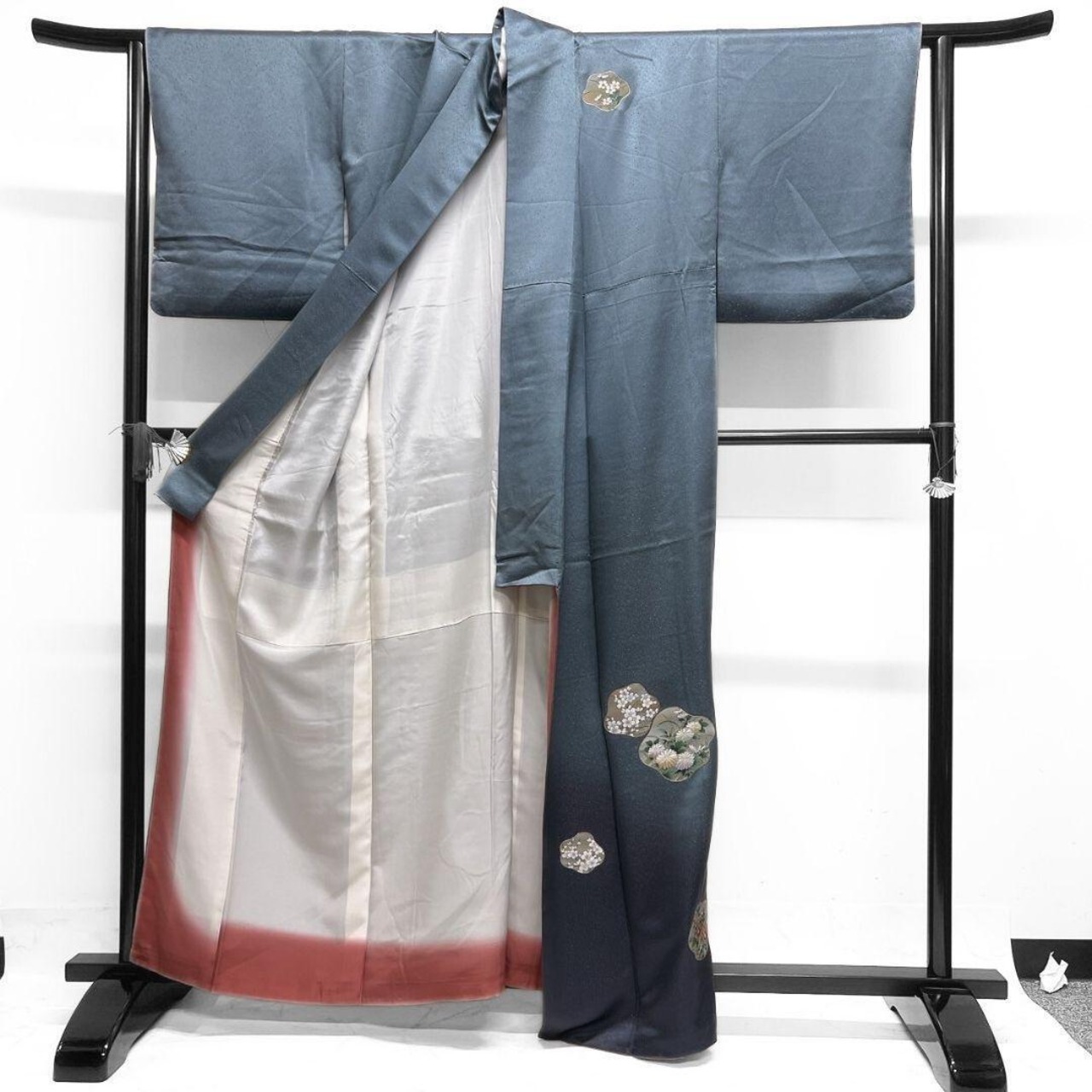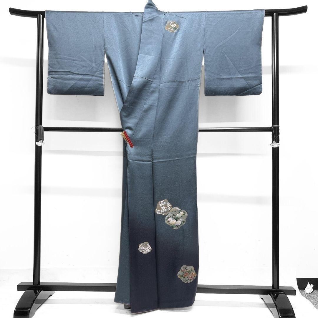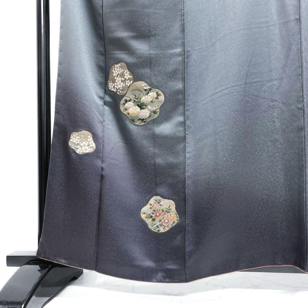 金彩があしらわれ、梅花や菊花、椿が描かれた付け下げです。