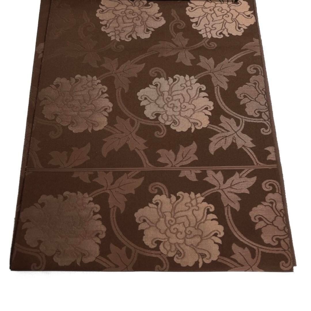 深いブラウンの地にくすみカラーの牡丹唐草が織られた華やかなデザインの一着です。