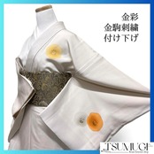 オフホワイトの地に金駒刺繍と金彩を交えて描かれた抽象的な花模様が可愛らしいお洒落な雰囲気の一着です。