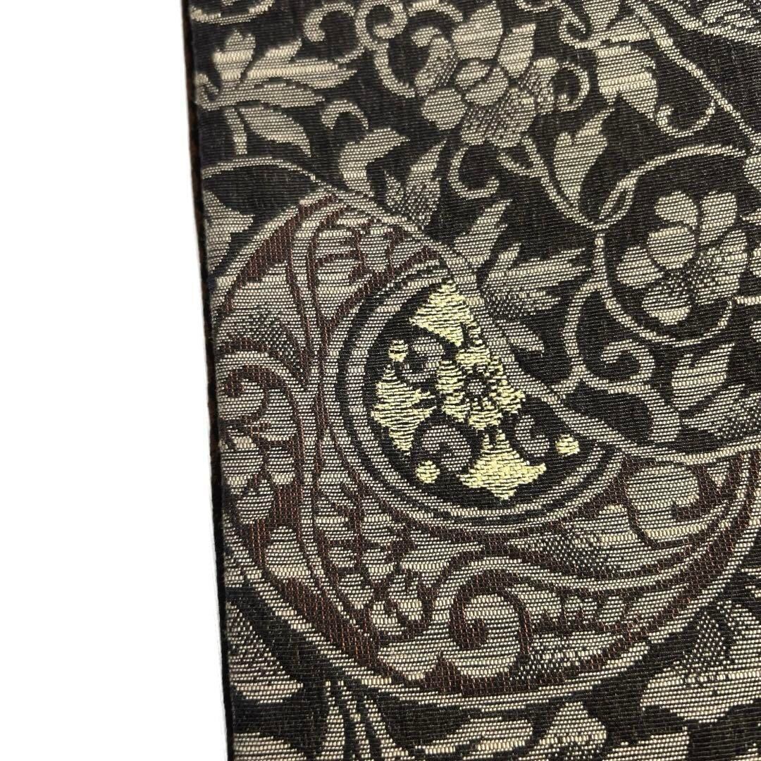 黒の掬いの地に道長取りと花紋に唐花や唐草、七宝が織られた華やかなデザインの一着です。