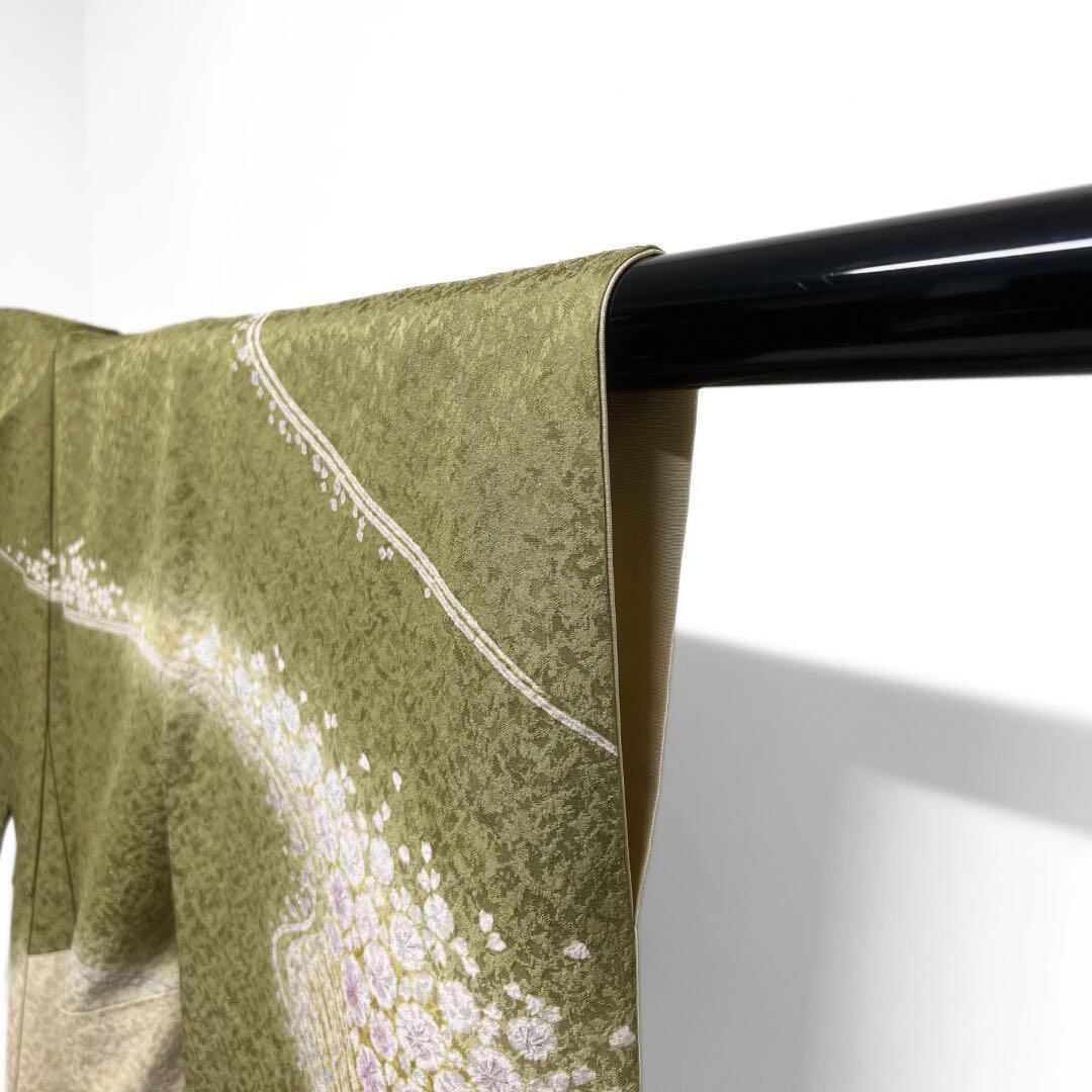 くすみグリーンとアイボリーの銀通しの地に流水と色紙散らし、桜と花びらが描かれた華やかなデザインの一着です。