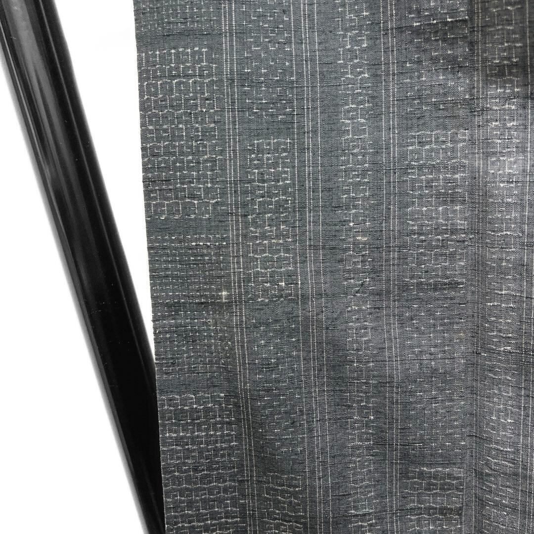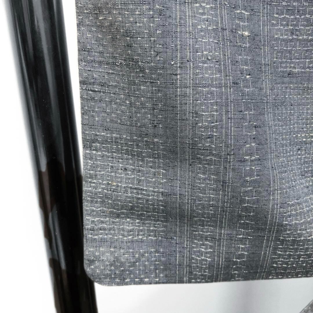 草木染の青みのある紬のグレー地に縦縞模様と絣と亀甲の文様がお洒落な一着です。