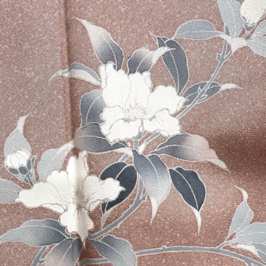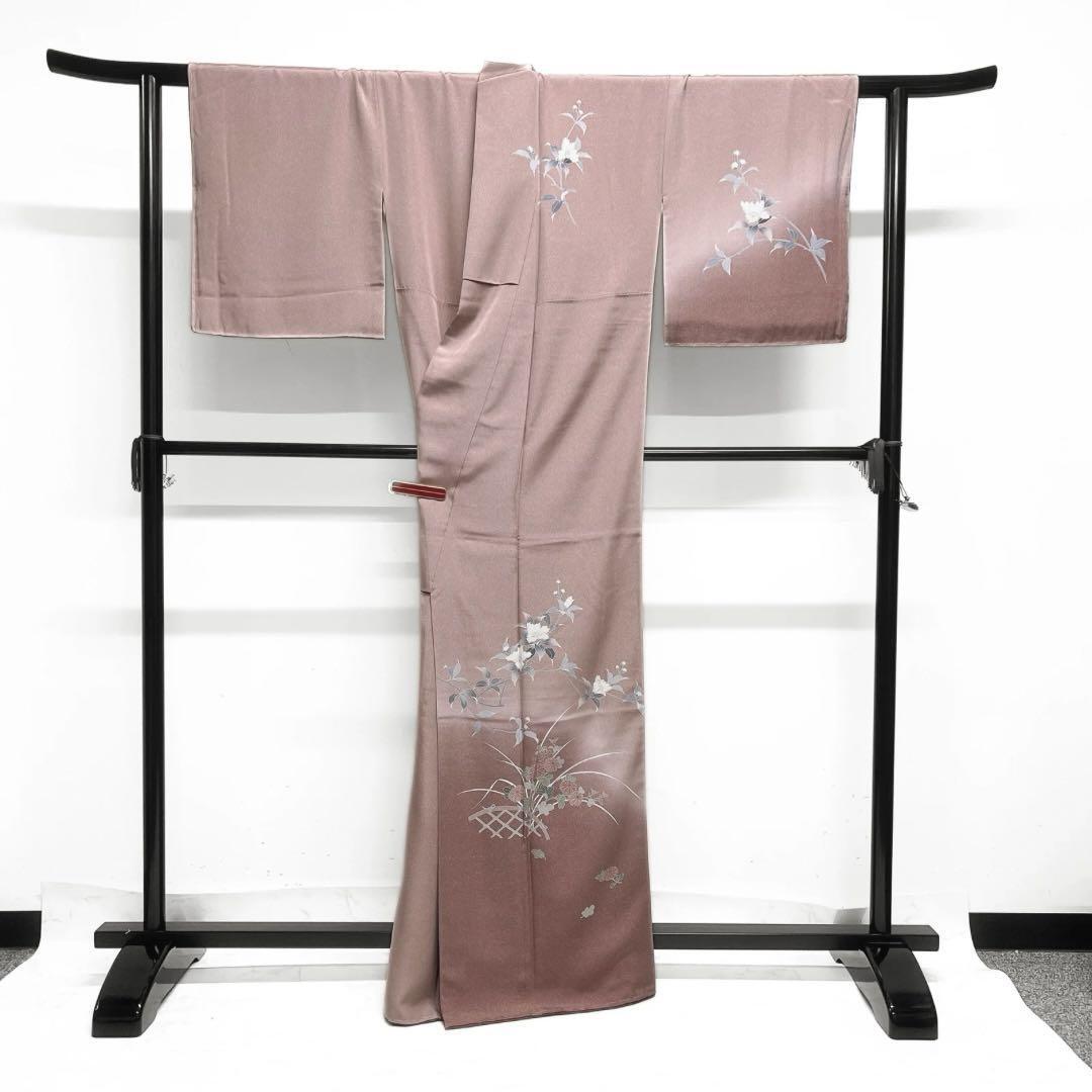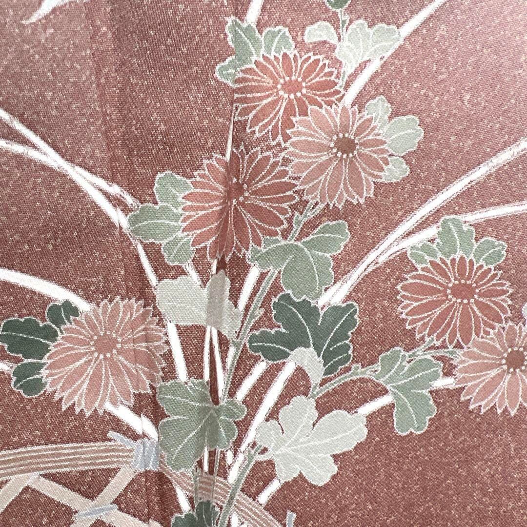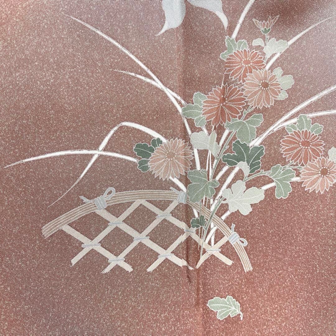 薄いくすんだパープルの地に菊と桜の文様に蛇籠が描かれた華やかなデザインの一着です。
