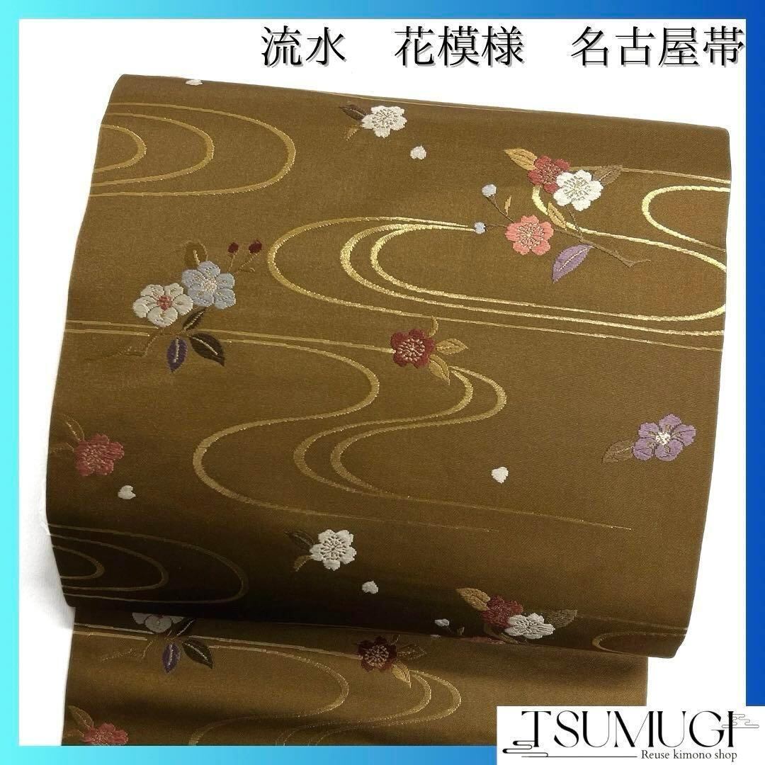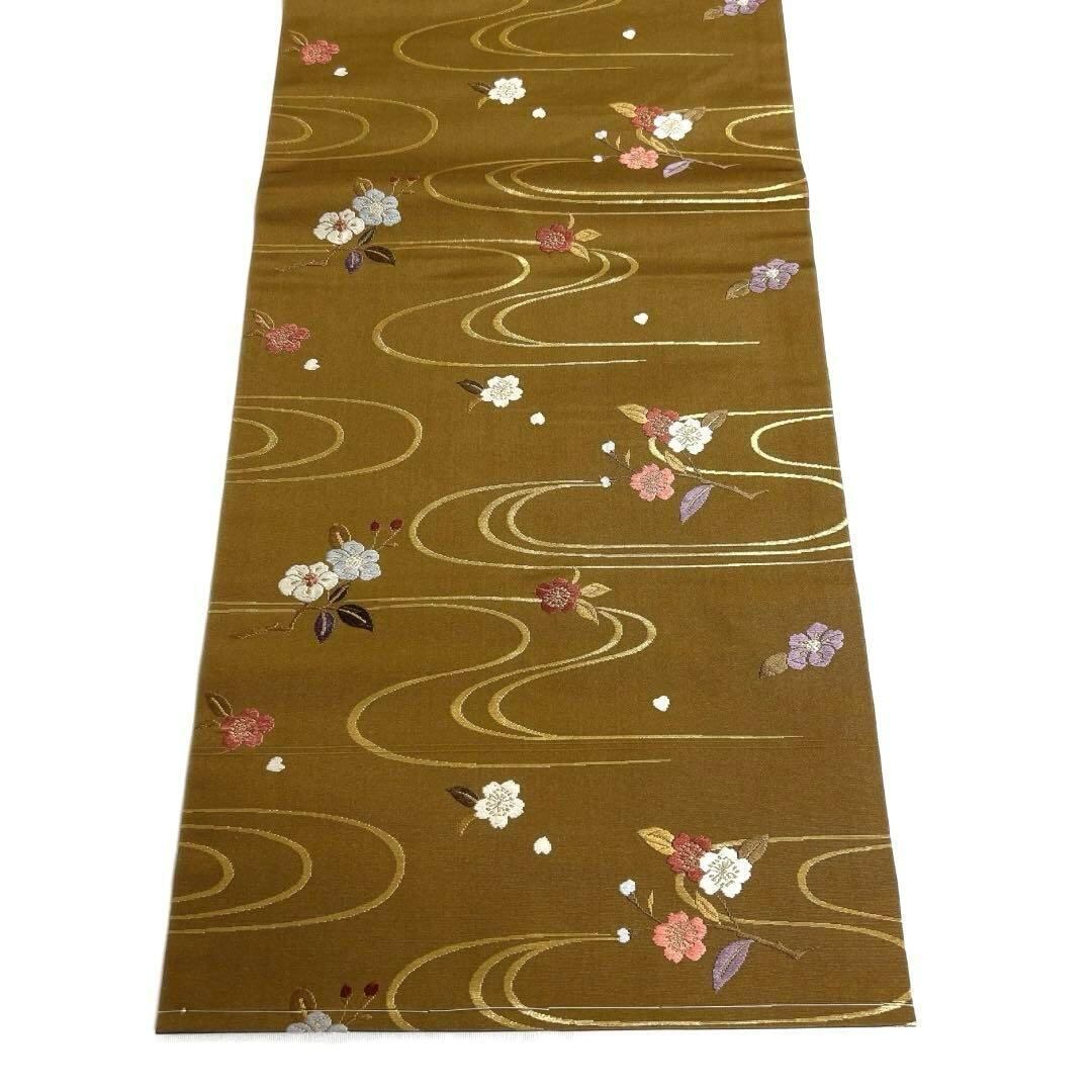 くすみブラウン地に金の流水と桜や鉄線が織られた華やかなデザインの一着です。