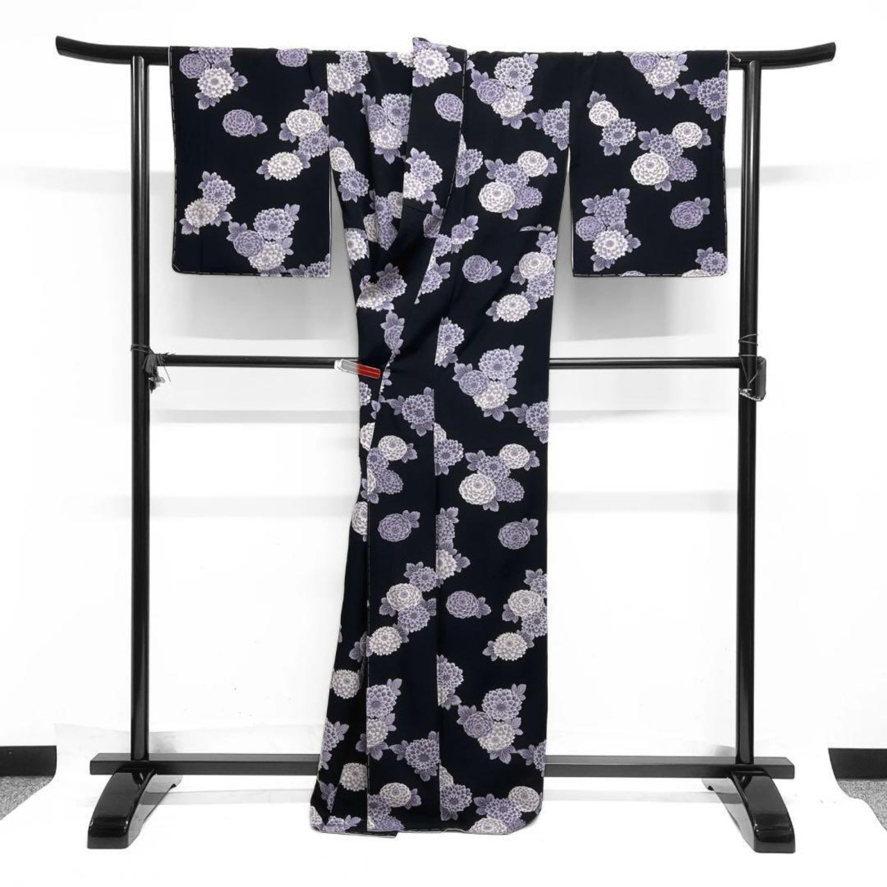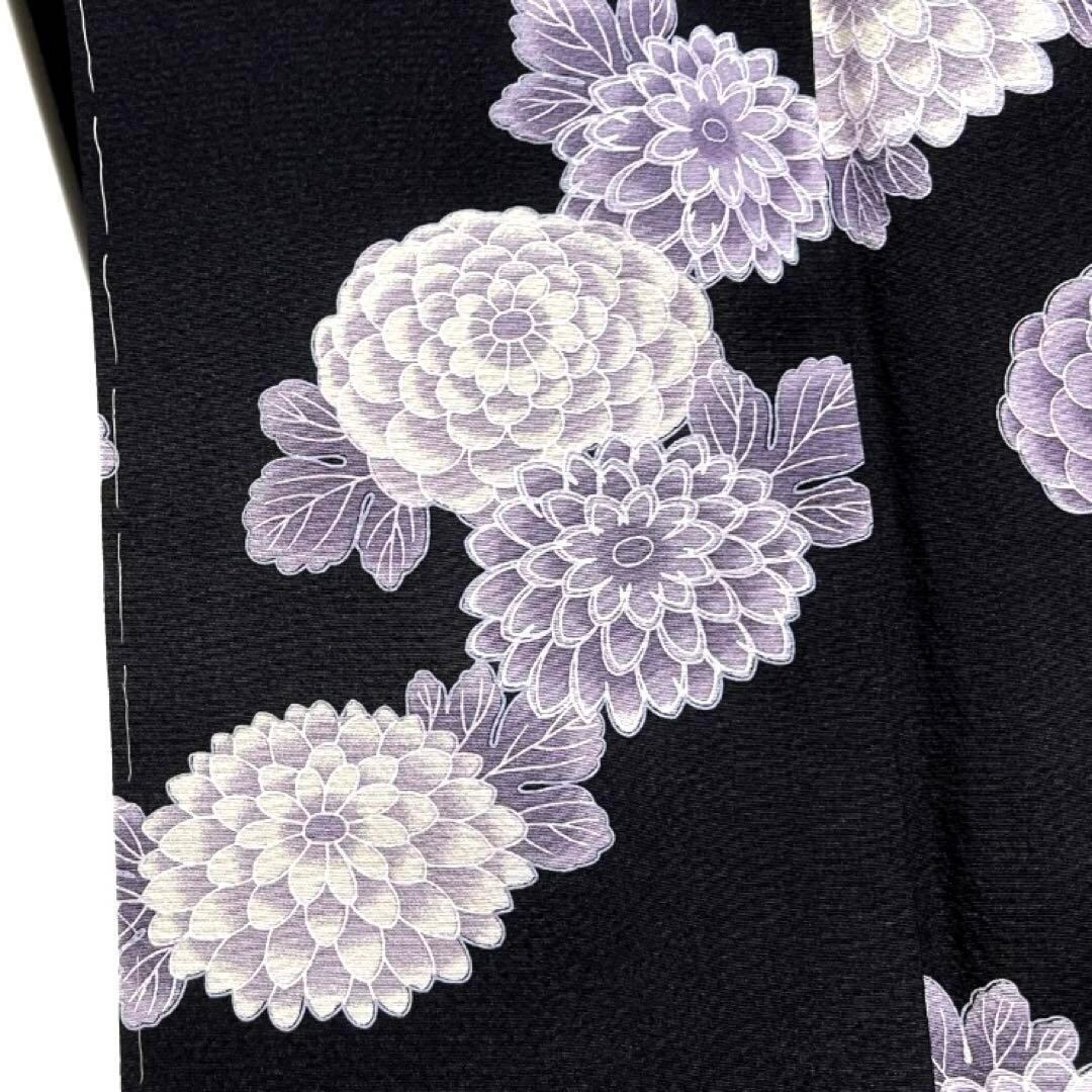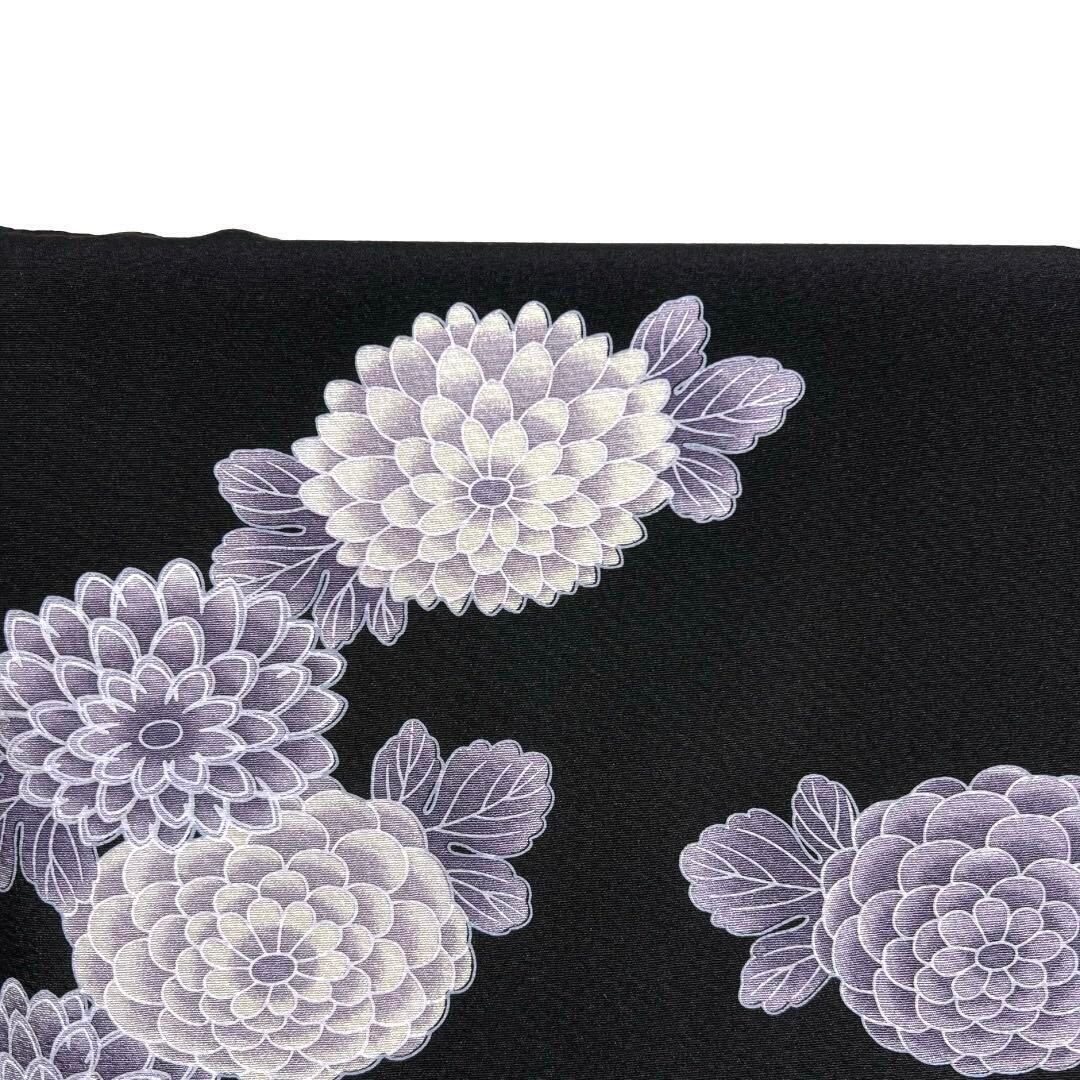 黒地に映えるパープルで描かれた菊花の文様がお洒落なデザインの一着です。