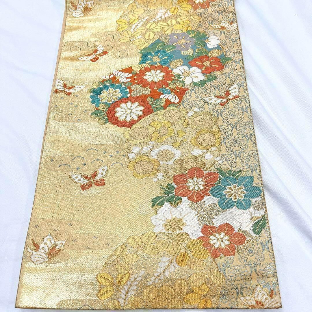 蝶と花紋の袋帯です。金色地に霞模様の中に様々な文様、色鮮やかな家紋が美しい一本となっております。