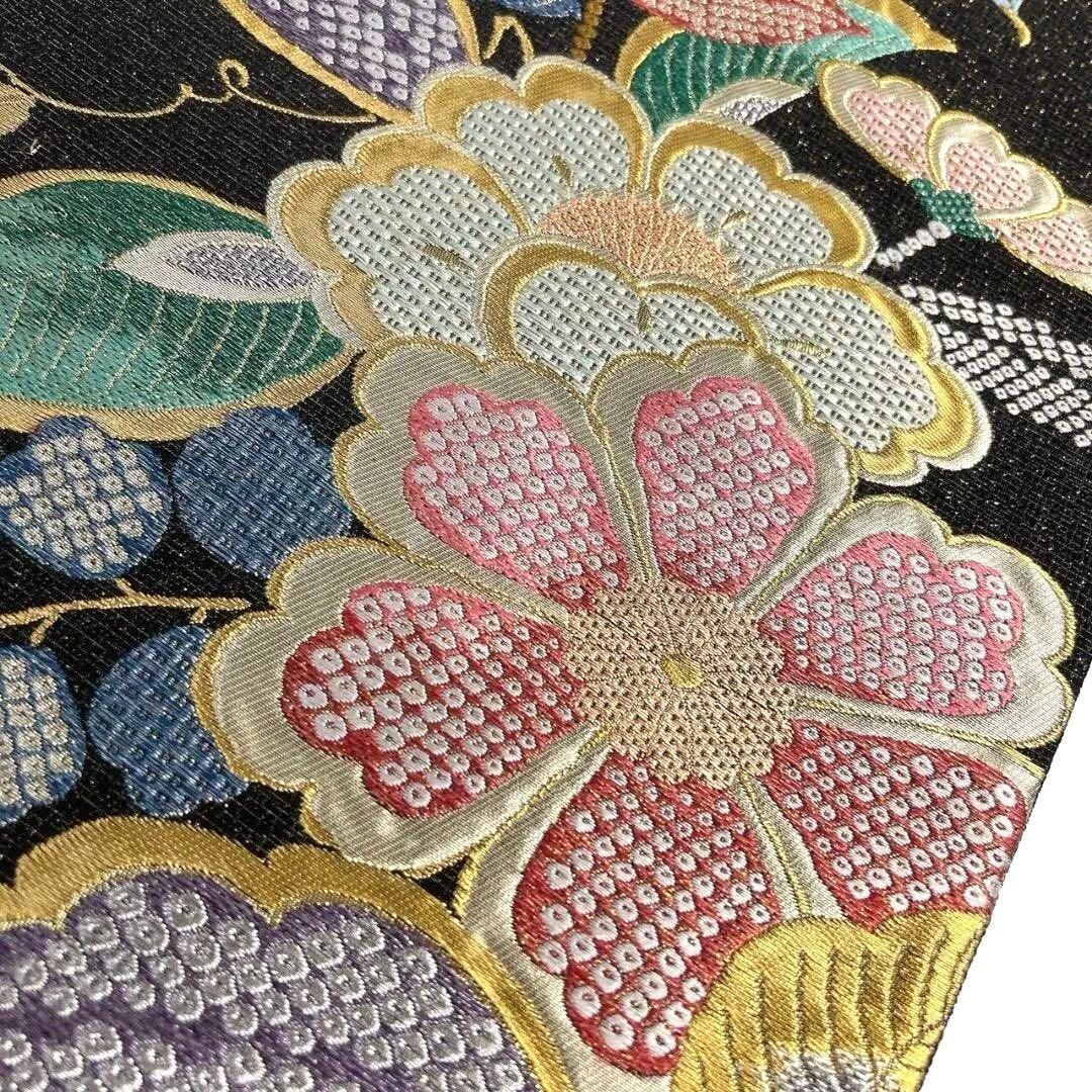 金通しに椿や桜花、藤の花が織り出された袋帯です。