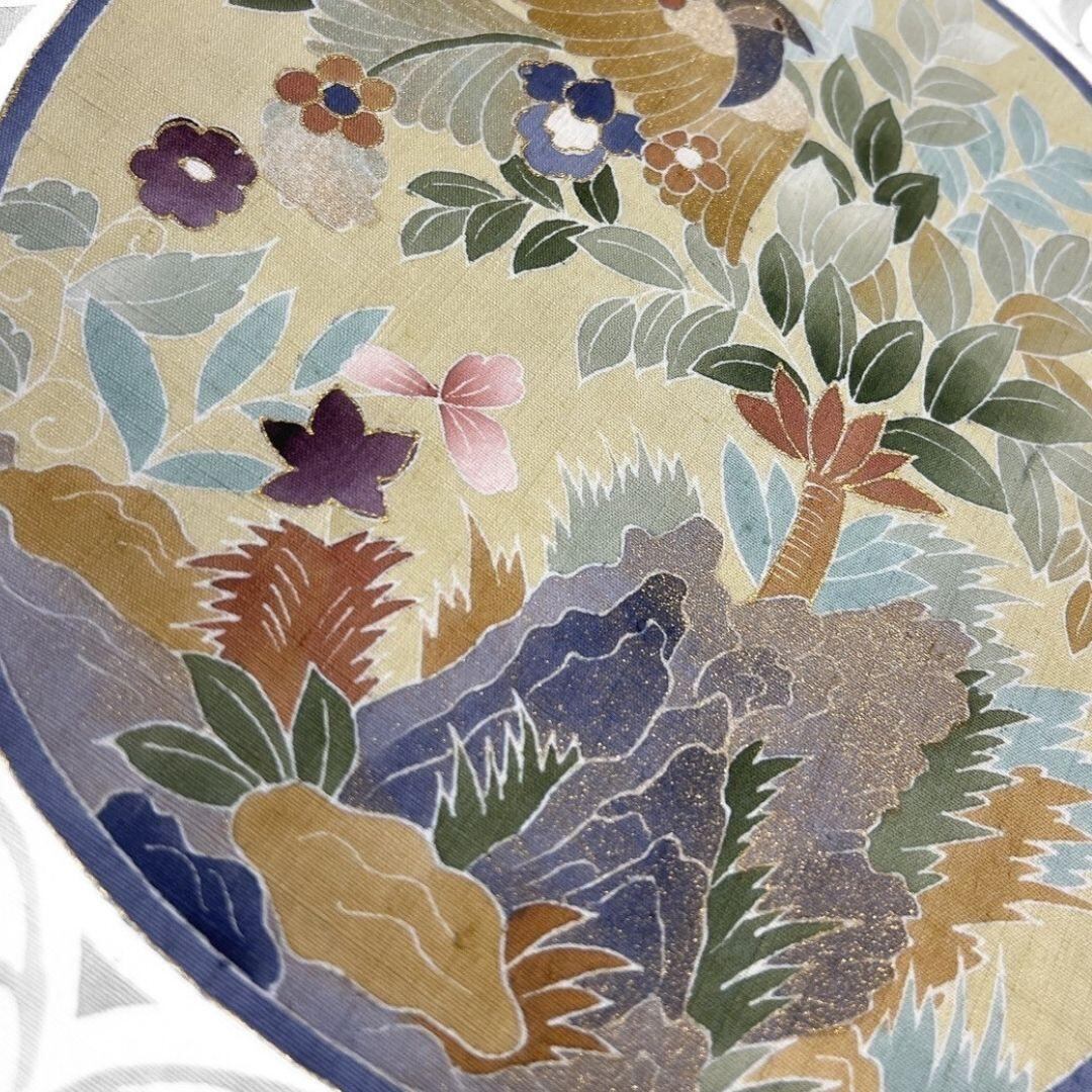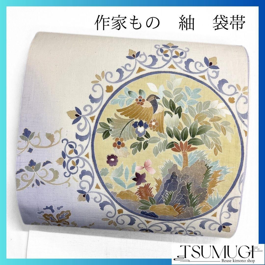 作家もの、紬地に唐花模様や花模様、鳥が描かれた袋帯です。