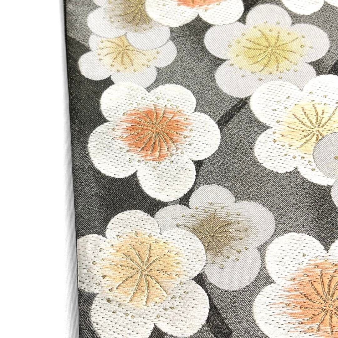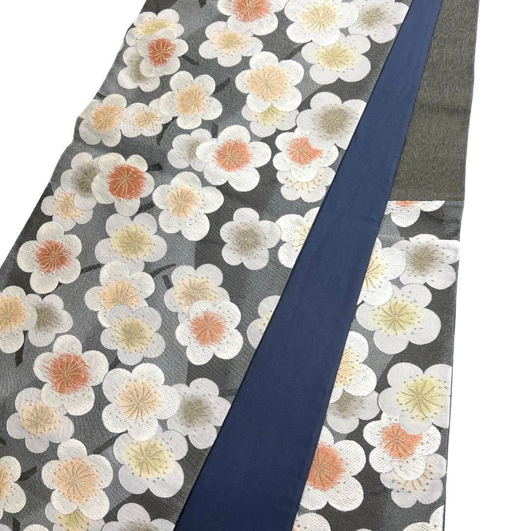 グレーの地に映える金糸を交えて織られた梅花の文様が華やかなデザインの一着です。