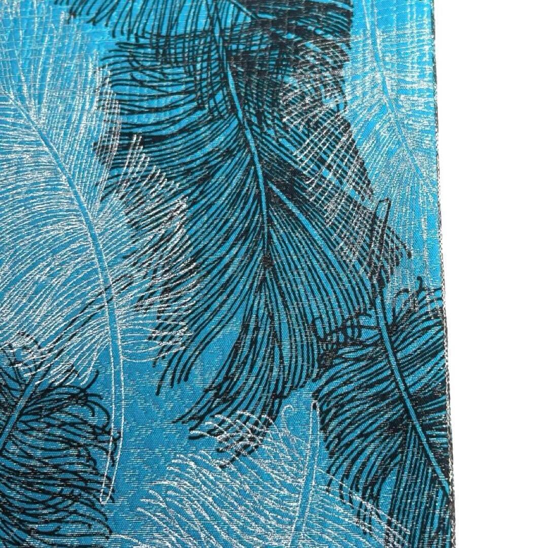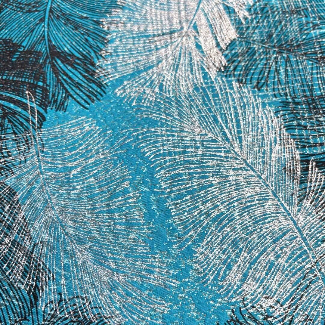 鮮やかなターコイズブルーの地に銀彩で描かれた羽根の文様が目を惹く華やかなデザインです。