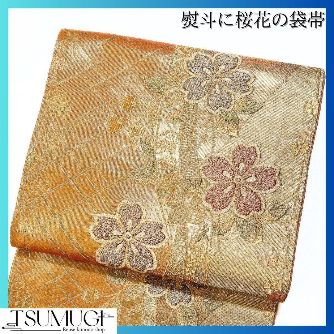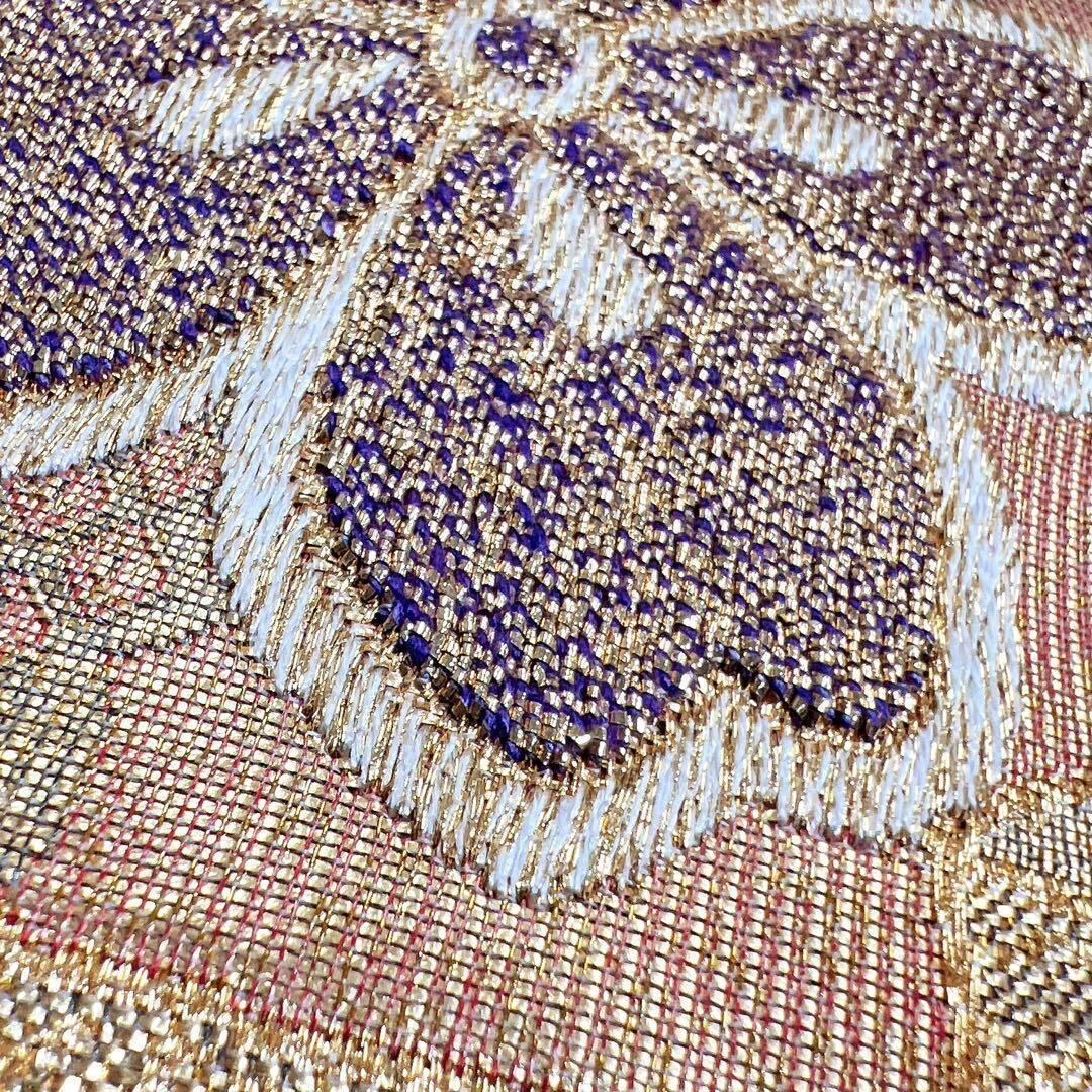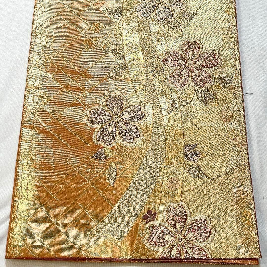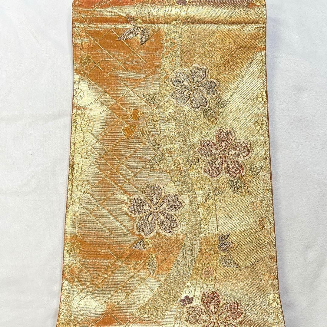 縦に熨斗で取られた変わり格子と縞模様に織られた桜花の模様が華やかで絢爛な一着です。