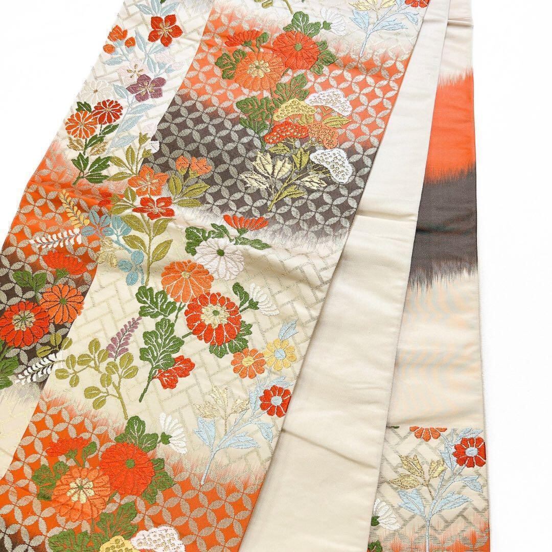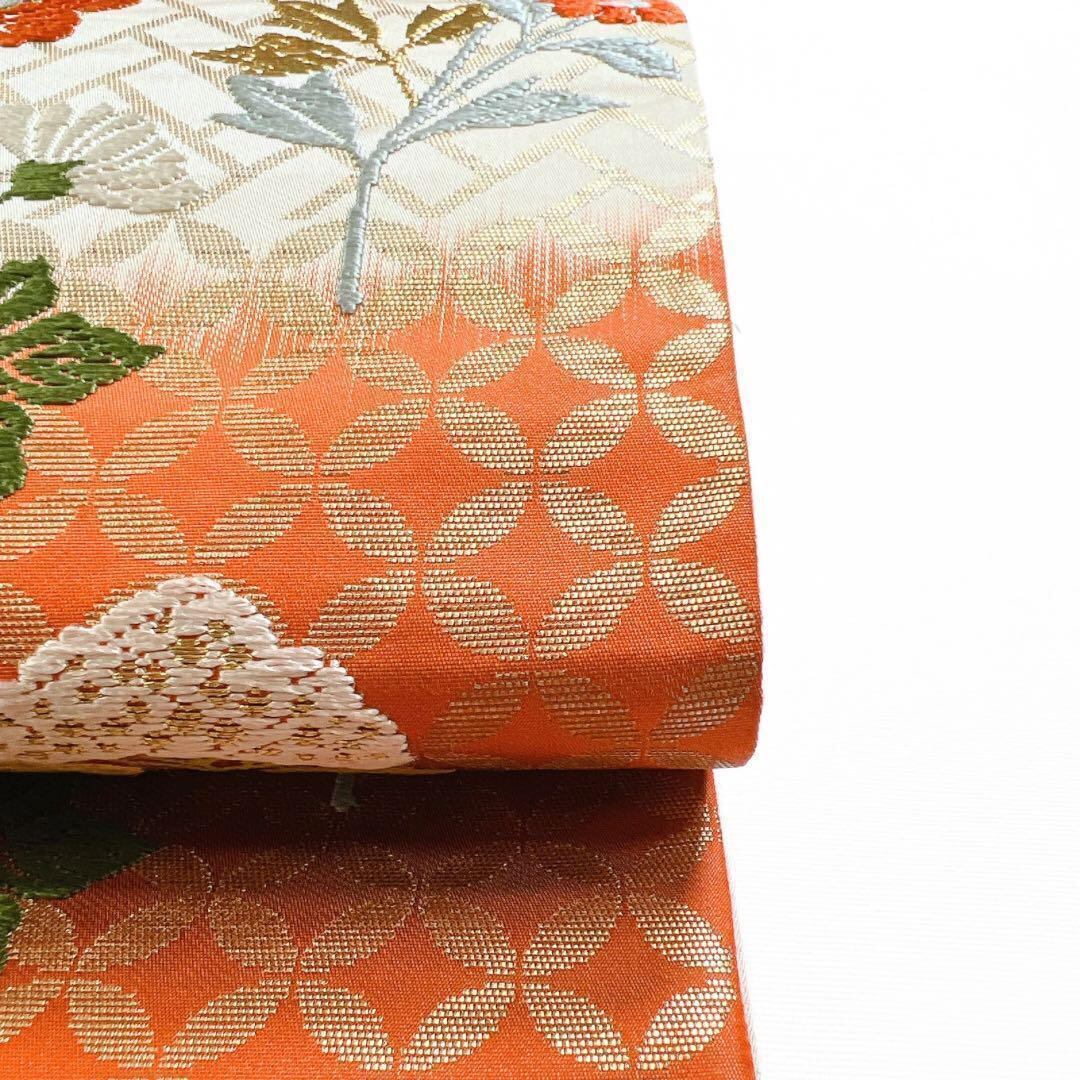 七宝と檜垣が織られた白とオレンジとグレーの地に様々な花模様が織られた華やかな一着です。