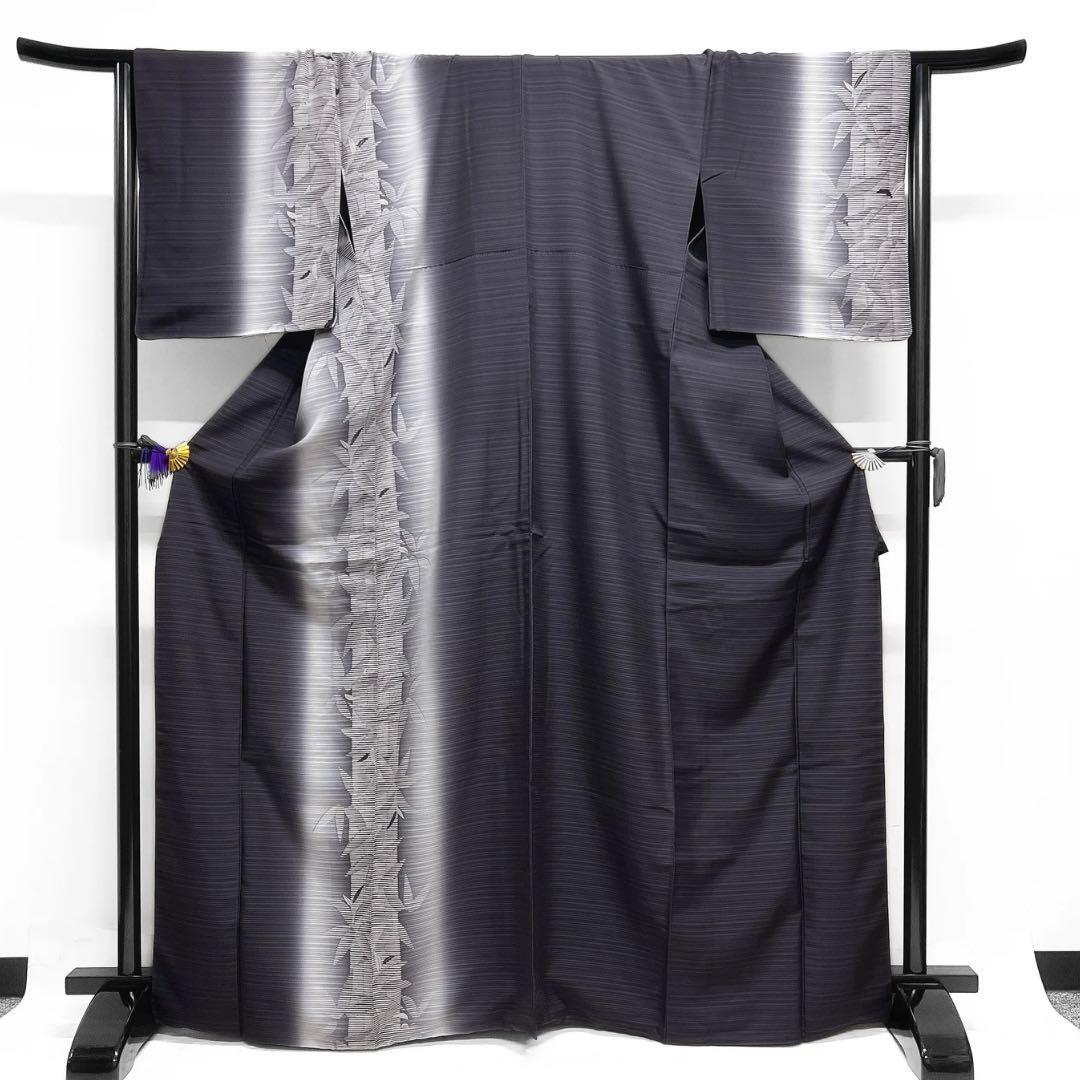 絽のグレーの地に縦に金彩を交えて白のグラデーションで描かれた竹の文様がお洒落なデザインの一着です。