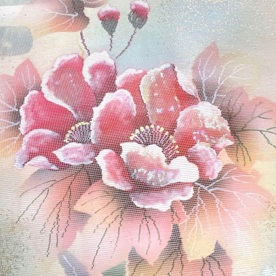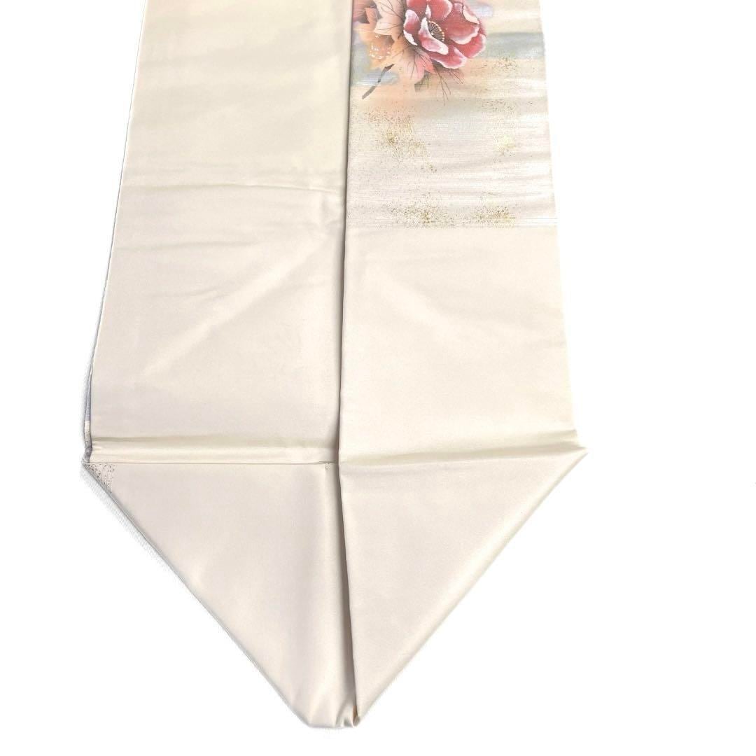 白地に氷割れ文様のヱ霞と螺鈿箔を交えて描かれた牡丹の文様が華やかなデザインの一着です。