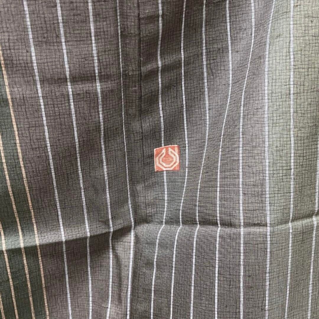 牛首紬にくすみカラーの地に縦縞文様とよろけ縞の文様が織られたお洒落なデザインの一着です。