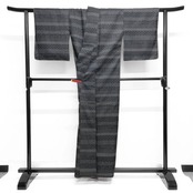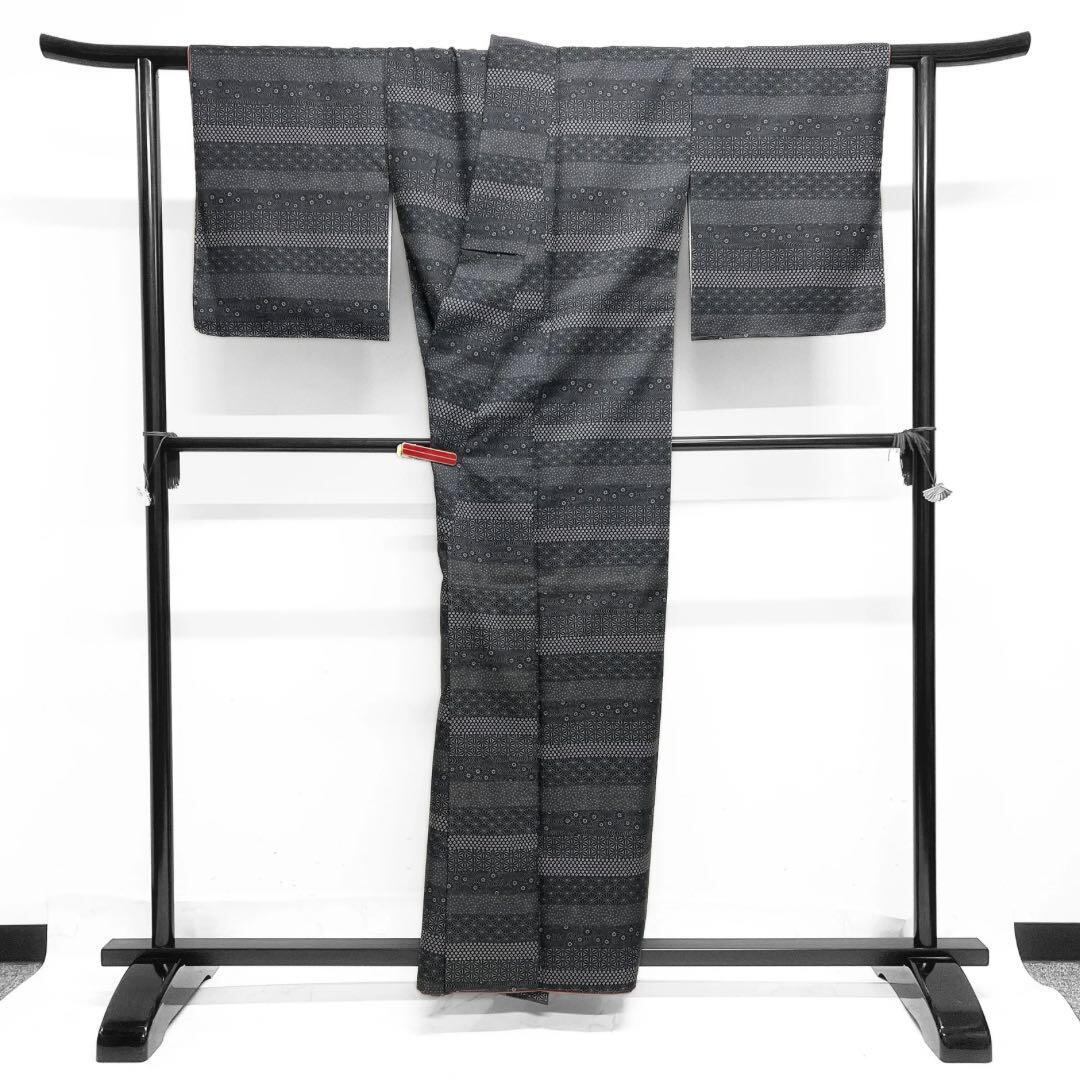 黒地に白のモノトーンの横縞で描かれた菊青海波や麻の葉、流水や鮫小紋がお洒落なデザインの一着です。