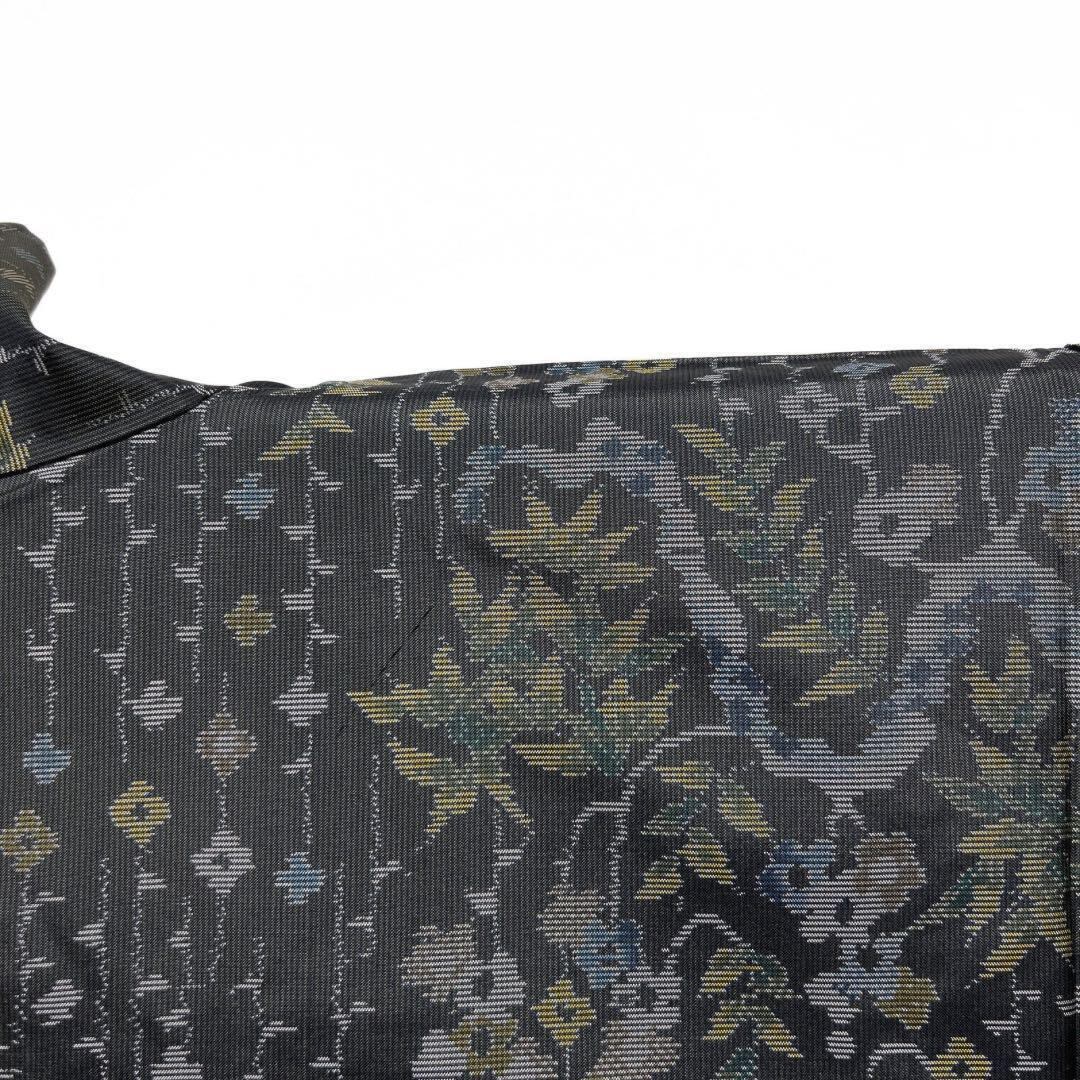 グリーンと黒の縦縞の大島紬地に枝垂れの花模様とリーフに霞文様が織られたお洒落な一着です。