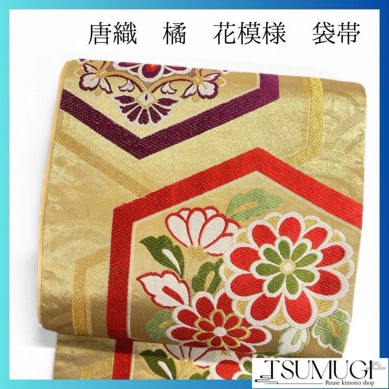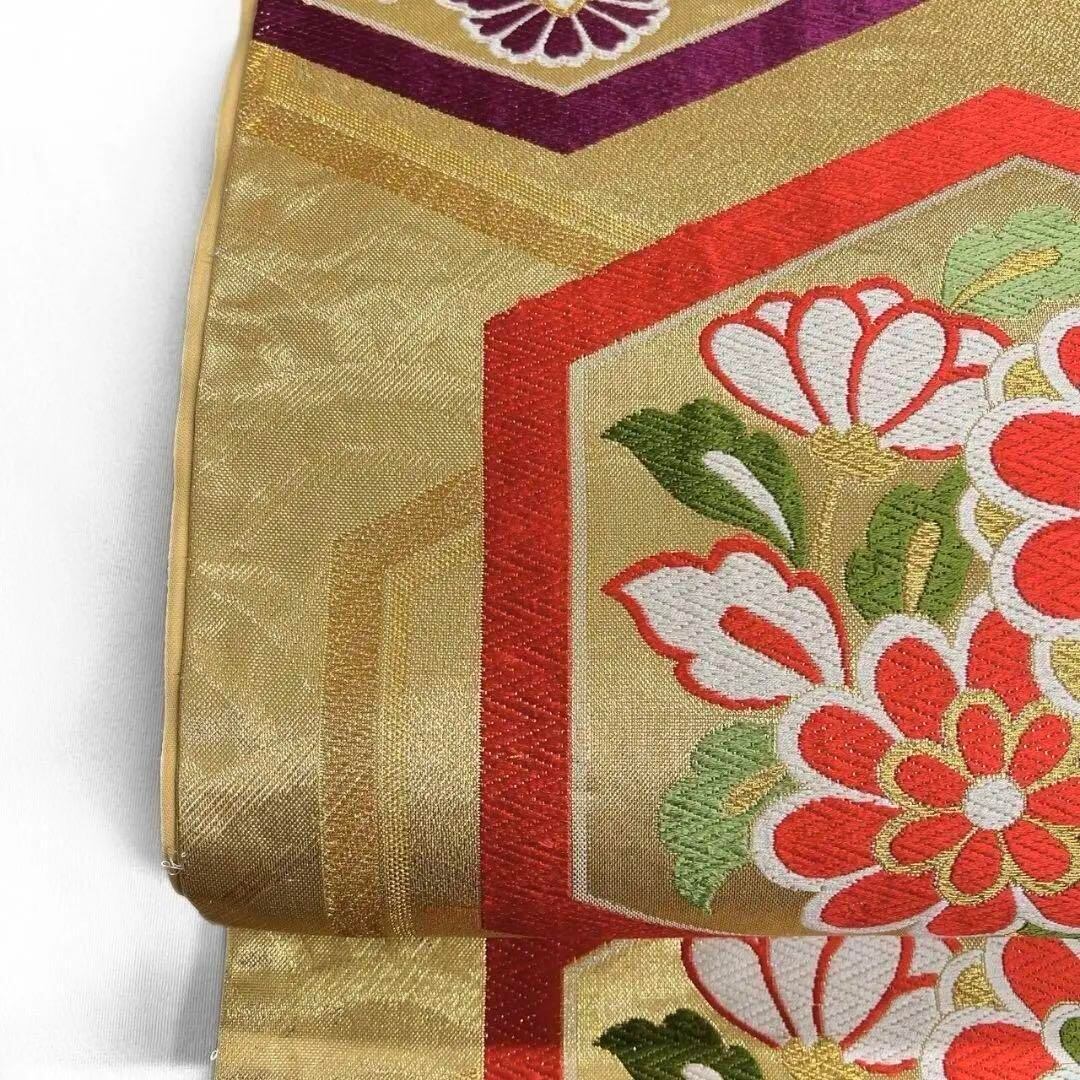 唐織で六角や菊花、花紋が織り出された袋帯です。