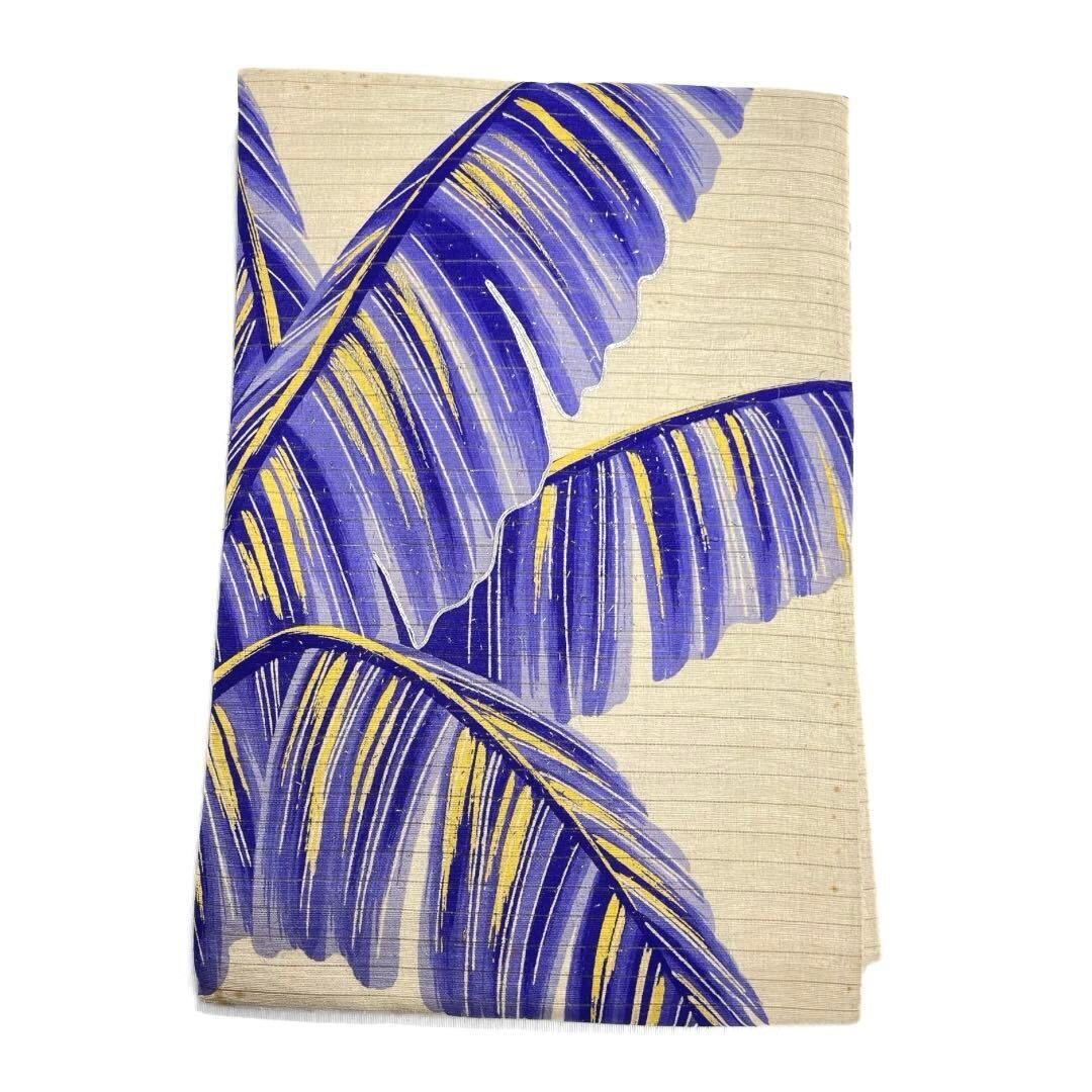 絽のオフホワイト地に銀駒刺繍を交えて描かれた芭蕉の文様が目を惹く華やかなデザインの一着です。