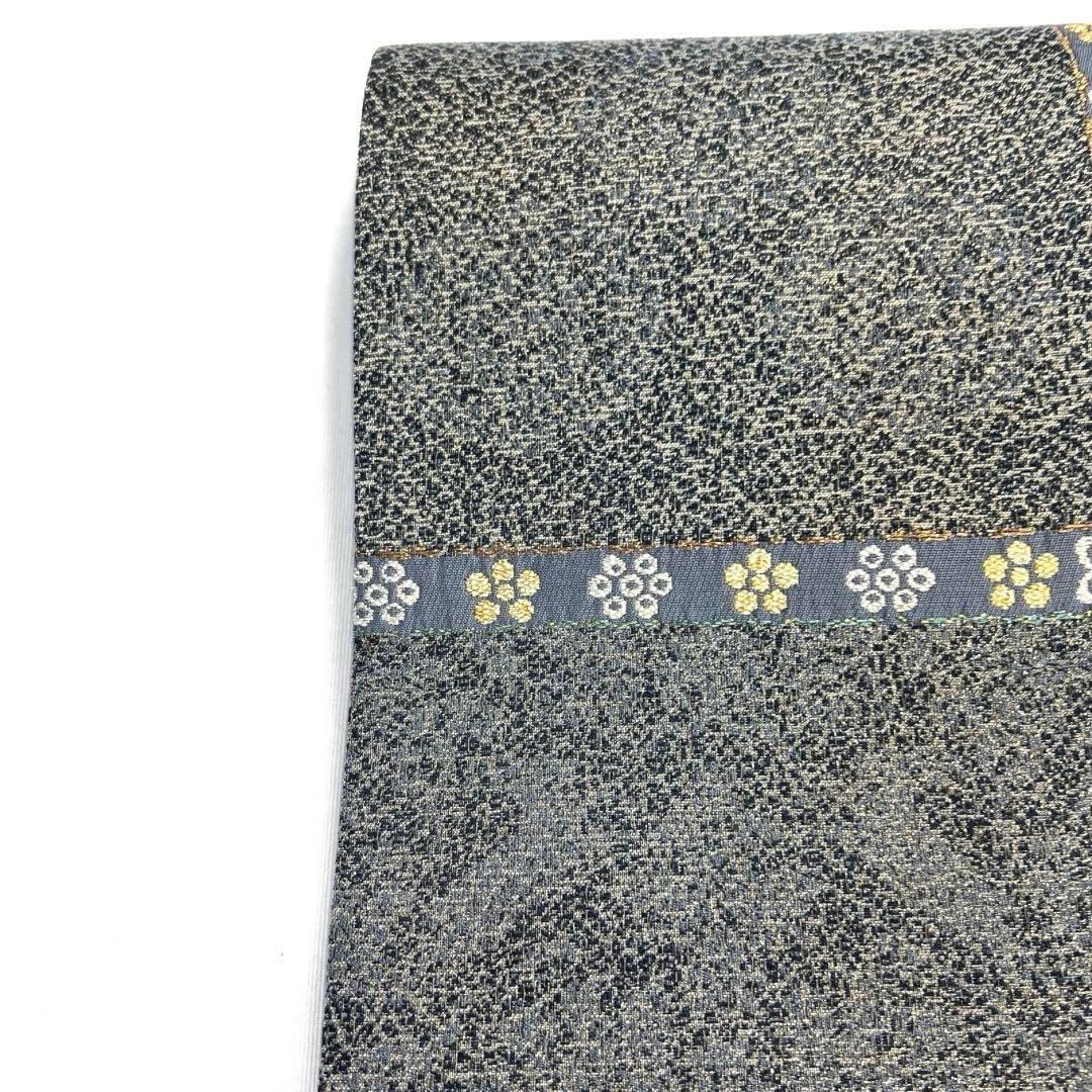 金糸と錦糸を通した地にグレーの格子と梅と華紋が華やかなデザインの一着です。