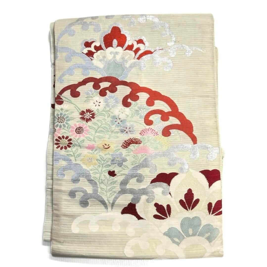 オフホワイトに近いごく薄いくすんだグリーンの絽の地に花模様に波や華紋が織られたお洒落なデザインの一着です。