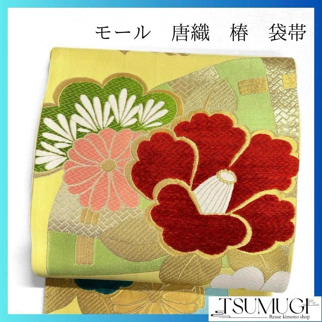 柔らかなイエローカラーに椿や菊花、松が華やかに織り出された一着です。