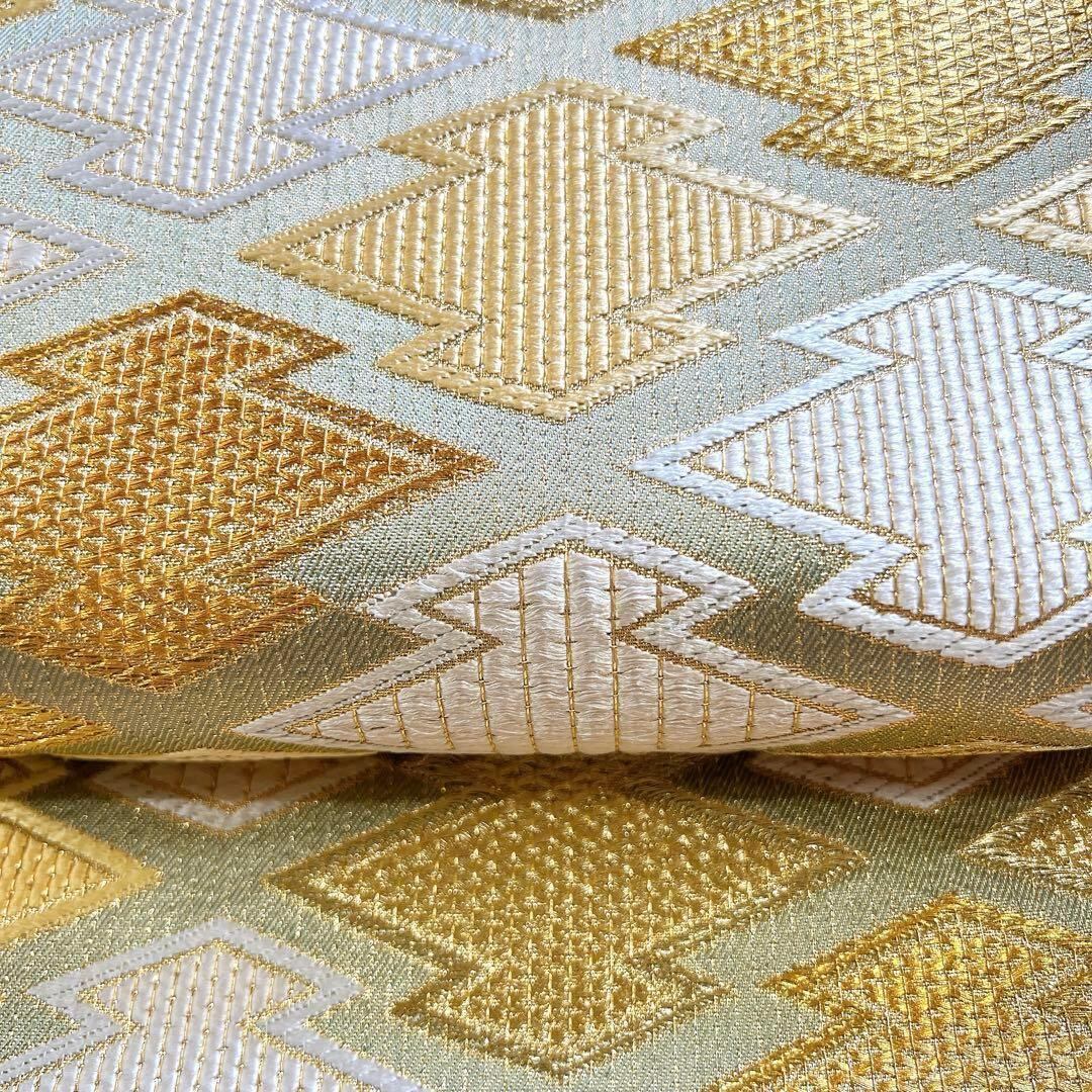 金糸が織り込まれた薄いくすみグリーン地に全面松川菱が織られています。