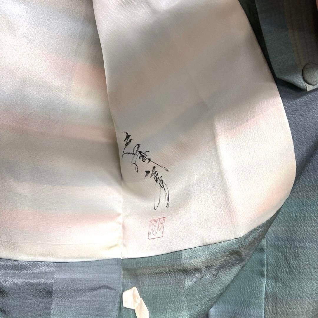 丹後ちりめん地にくすみカラーのグラデーションに横縞の文様が描かれたお洒落なデザインの一着です。