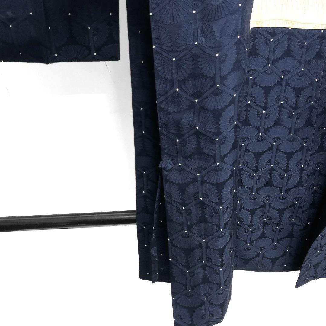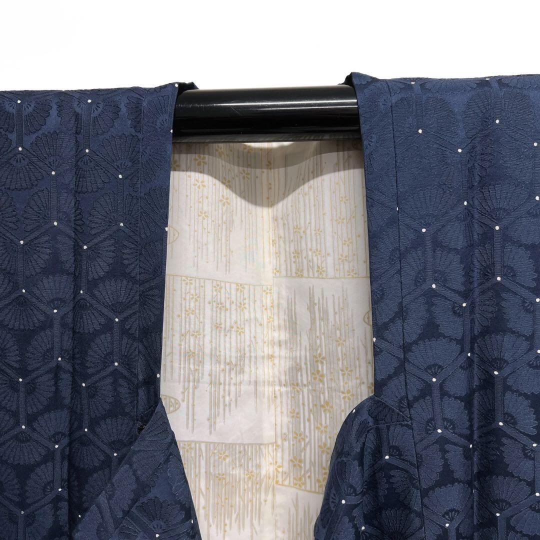 深いネイビーの地に亀甲地紋と扇と織られたお洒落なデザインの一着です。