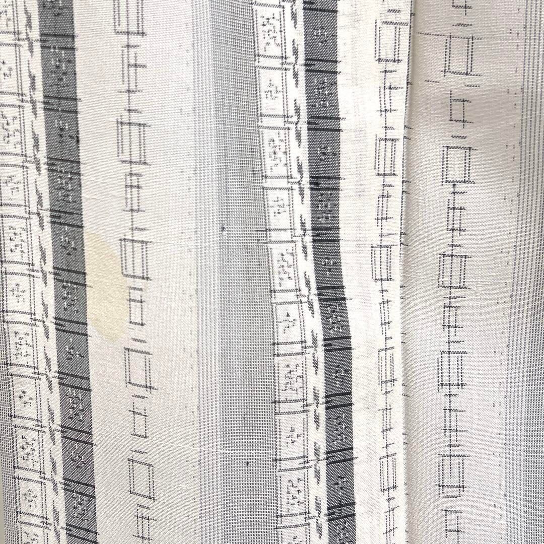 白の紗紬の地に縦縞で織られた絣の文様がお洒落なデザインの一着です。