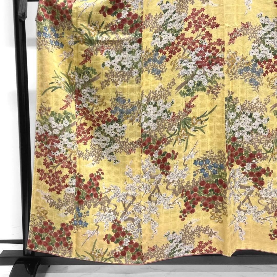 イエロー地に格子の文様と様々な花模様が織られた華やかでお洒落な一着です。