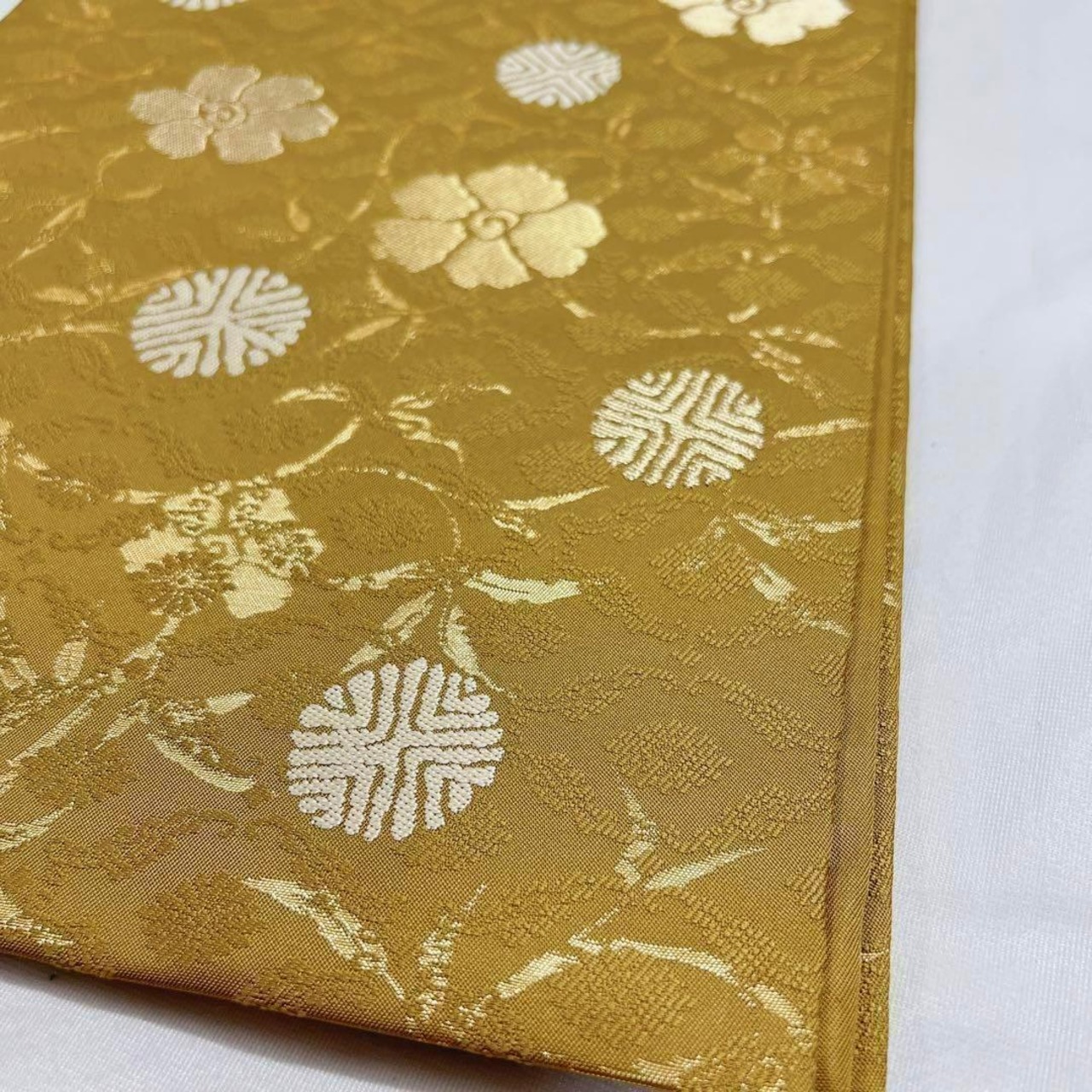 細やかに織られた花模様の地紋と、様々な金色のカラートーンがあしらわれた抽象花模様が美しい1着です。