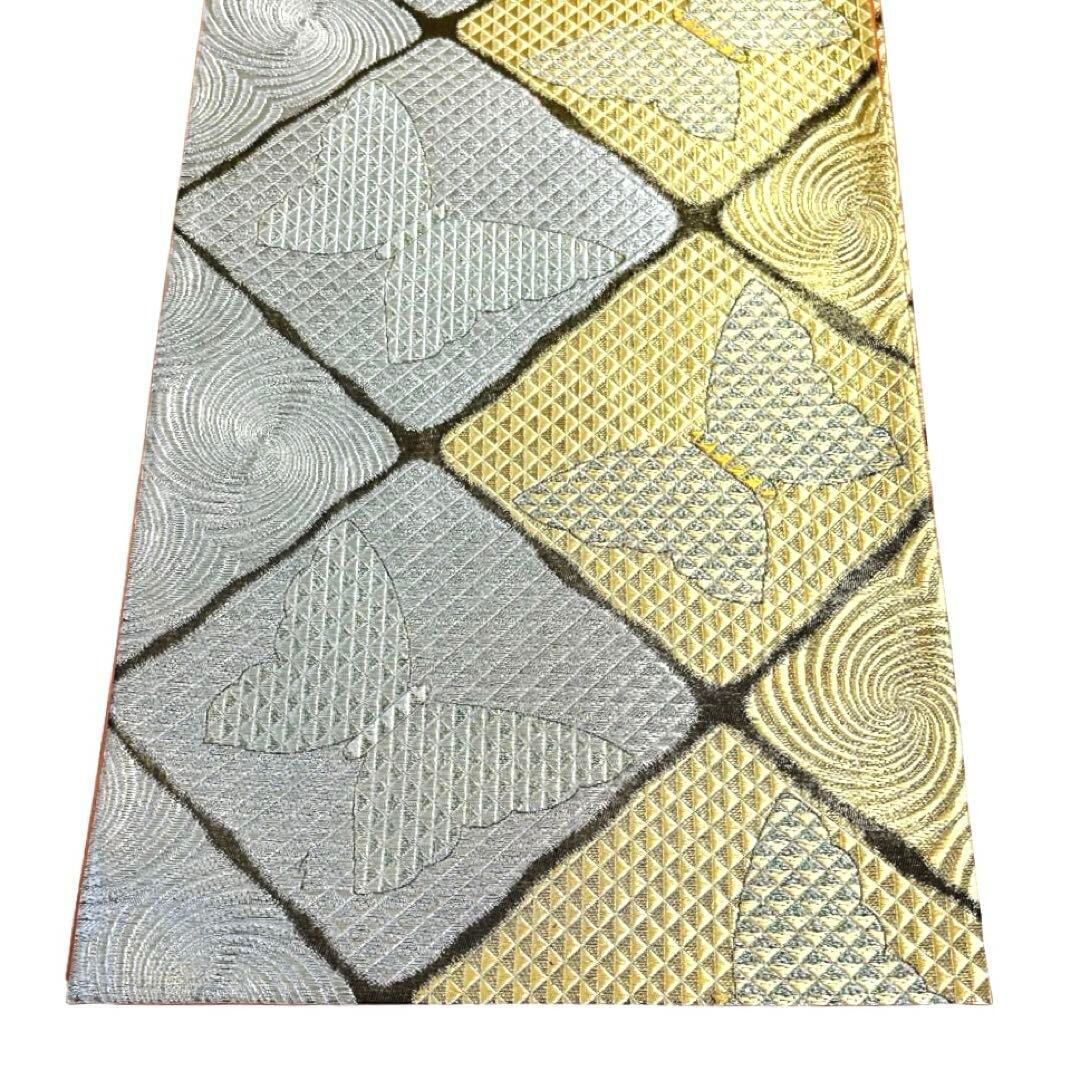 ゴールドとシルバーで織られた斜め格子に渦巻きの文様と蝶の文様が目惹く華やかなデザインの一着です。
