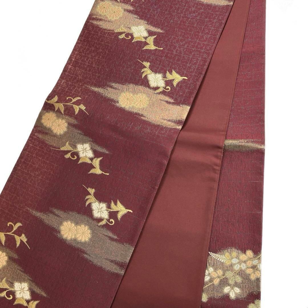 深いワインレッドの格子地に金糸を交えて織られた菊に桜や萩と流水や扇の文様が華やかなデザインの一着です。