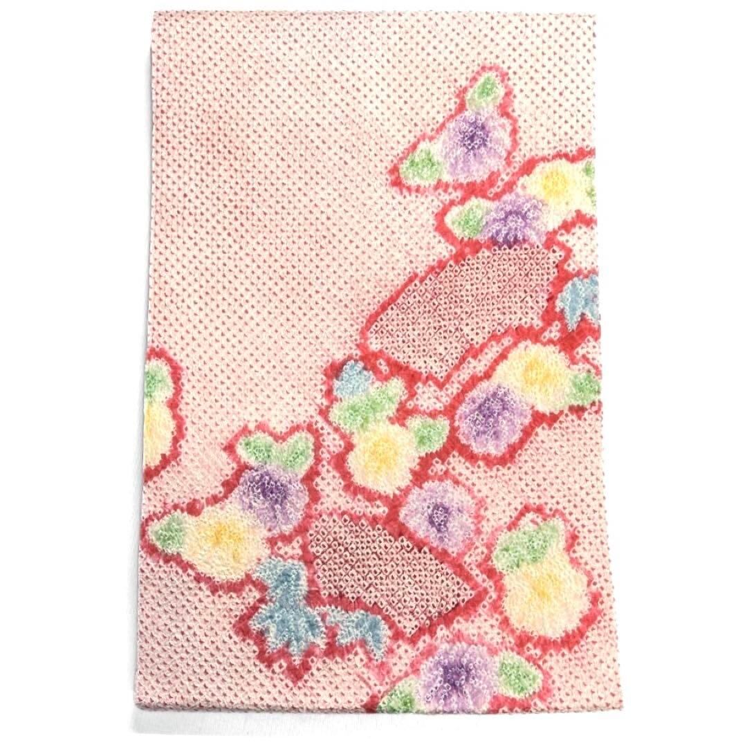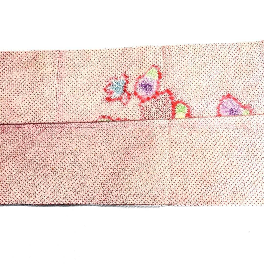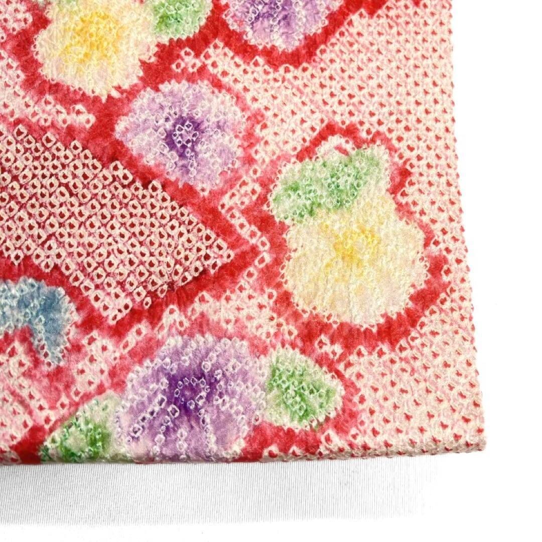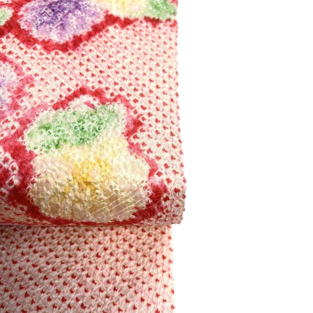 濃淡のあるピンクの総絞りに映える菊や竹、扇が鮮やかに描かれたお洒落なデザインの一着です。