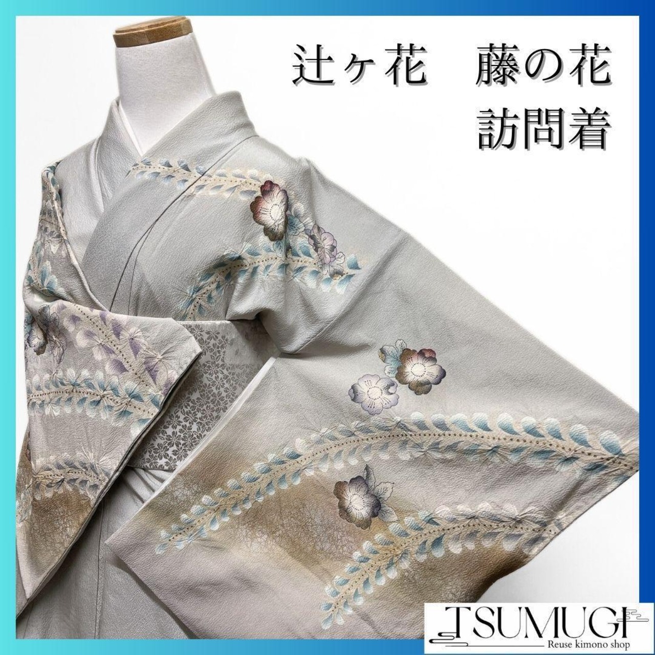 くすみカラーに辻ヶ花と藤の花、梅花が繊細に描かれた一着です。