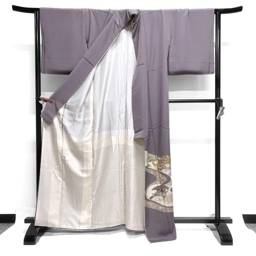 くすみパープルの地に流水と金駒刺繍と帝王紫染の刺繍を交えて描かれた扇に様々な花模様が華やかなデザインの一着です。