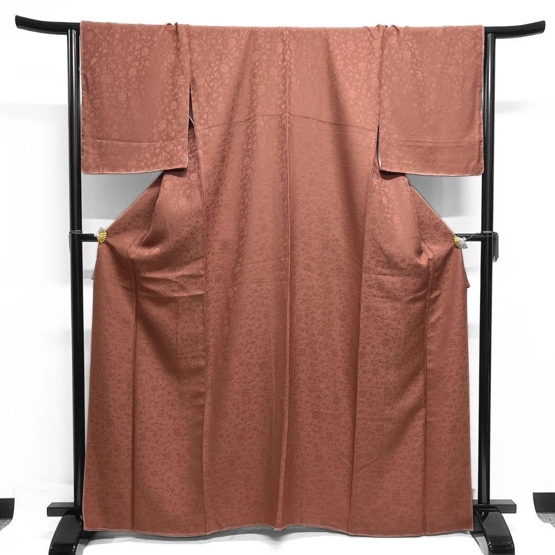 ちりめんのくすんだ朱色の地に牡丹唐草地紋が織られたお洒落なデザインの一着です。