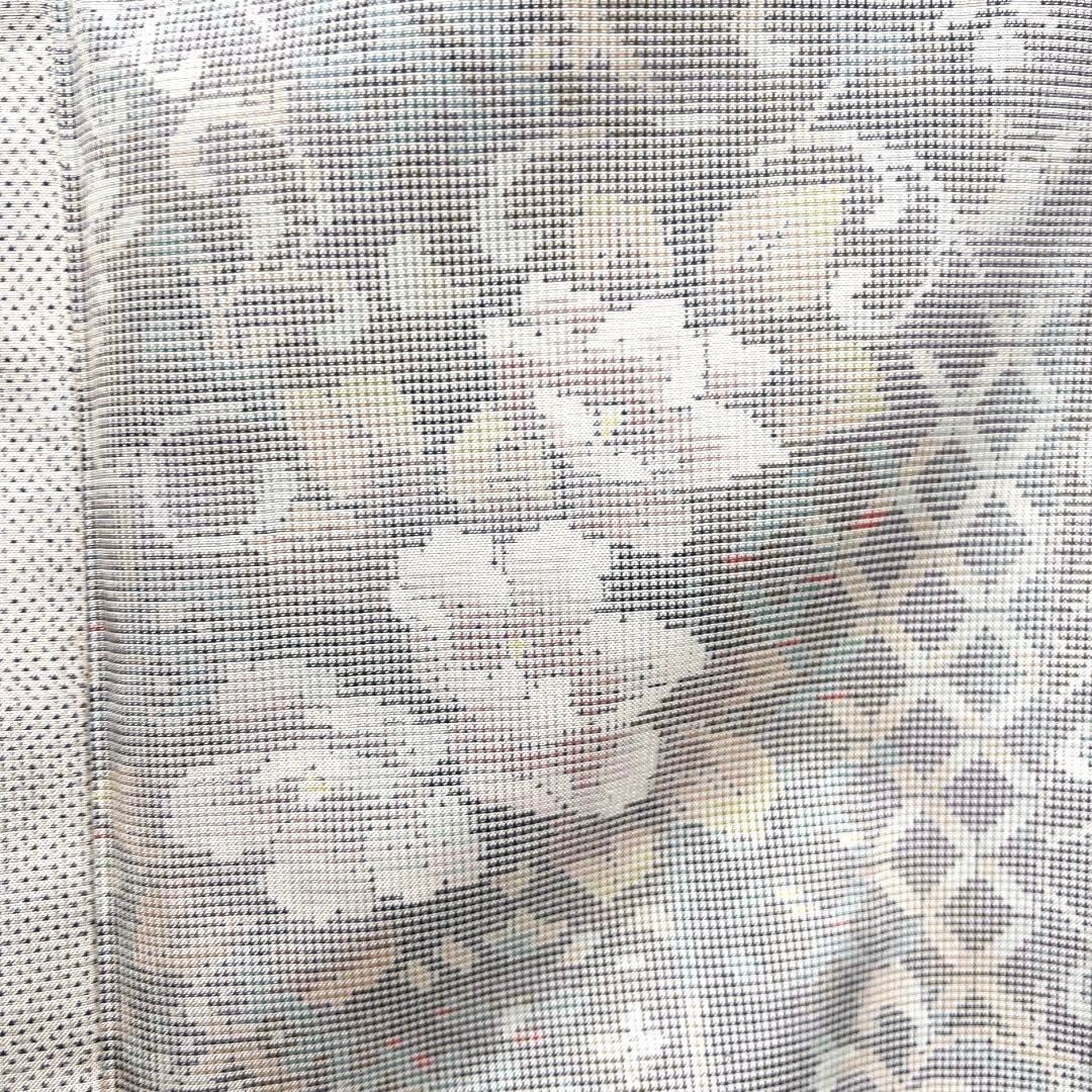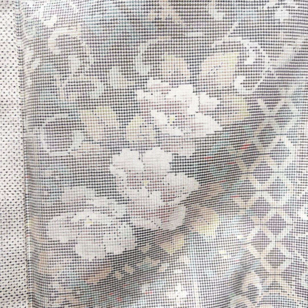 福原大島紬工場の白大島紬地に手織りで細やかに織られた花模様と格子や蜀江紋、紗綾形がお洒落なデザインの一着です。