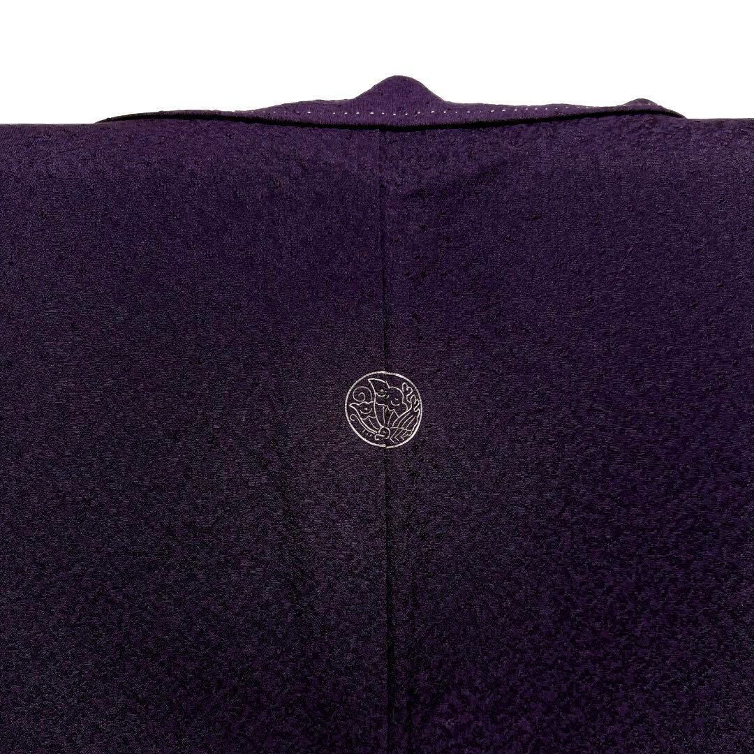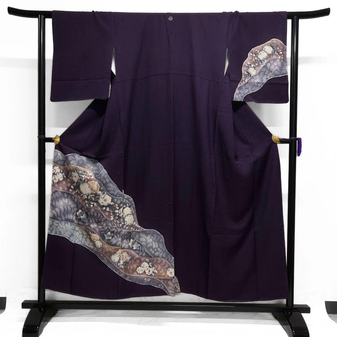 深いパープルの地に映える道長取りに辻ヶ花やリーフの文様が華やかなデザインの一着です。